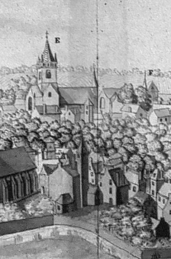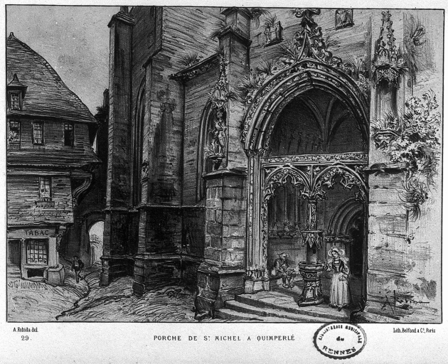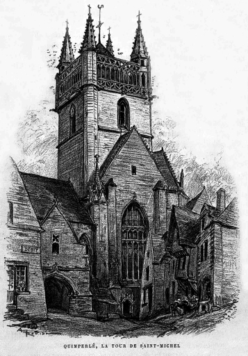 Dédiée à Notre-Dame, cette ancienne chapelle de la communauté des bourgeois de la ville prendra également le vocable de Saint-Michel en souvenir de l´ancienne église paroissiale voisine ruinée en 1765. On distingue, pour l´essentiel, deux campagnes de construction. D´un premier édifice bâti vers 1280 ne subsistent que les murs de la nef percés de baies et de grandes portes au nord et au sud et sans doute les traces d´un porche ouest (oculus sud), les autres parties ayant été ruinées au cours des guerres de Succession qui touchent la ville au milieu du 14e siècle. A la charnière des 14e et 15e siècles, une reprise hésitante et par endroits malhabile débute par la reconstruction du porche sud qui remplace un porche plus ancien probablement à étage, comme l´indique une porte haute bouchée qui pourrait correspondre à l´accès à un jubé de l´édifice originel. Egalement témoins du début de la reprise du chantier, les piliers ouest de la croisée du transept, cantonnés de colonnettes à chapiteaux, se greffent sur des piles carrées qui semblent correspondre à l´emplacement de l´ancien choeur. Une campagne d´agrandissement décisive, affectant le couvrement de la nef et surtout la construction de la partie orientale de l´édifice, débute en 1416 ou 1418 et se termine au milieu du 16e siècle. Grâce aux libéralités du duc Jean V, de Henry de Lespervez, l'abbé de Sainte-Croix de Quimperlé et de familles bourgeoises et aristocratiques de la ville (leurs armoiries figurent aussi bien à l´extérieur qu´à l´intérieur), le chantier inclut la mise en place du porche nord (achevé en 1425), de la charpente de la nef (datée 1430), de la partie orientale de la croisée du transept (piliers circulaires portant des voûtes à pénétration directe), du massif de la tour et du choeur dans lequel est inhumé Henry de Lespervez en 1434. La réalisation d´un jubé placé entre la nef et la croisée du transept, accessible depuis un escalier en vis logé dans la tourelle desservant également les parties hautes de la tour, demeure, en l'absence de traces de fixation, incertaine. Ce n´est qu´entre 1520 et 1550 que la croisée faisant fonction d´avant choeur, le transept non saillant et le choeur à chevet plat flanqué de chapelles latérales sont couverts de voûtes d´ogives. Depuis le 16e siècle, la tour abritait, en guise de beffroi, l´horloge de la ville qui était pourvue d´un mécanisme mettant en mouvement une statue de saint Michel ; détruite en 1590, elle a été rétablie en 1620. En 1636, Dubuisson-Aubenay mentionne l´édifice dont il vante le «fort haut et beau clocher couvert en plomb en 1621, comme il est écrit dessus en lettre noire». Ce clocher, construit sous Jean-François-Paul Gondi, abbé de Sainte-Croix et démoli en 1763, figure sur un dessin de 1736. Construite dans le prolongement du chevet, la sacristie, à usage commercial au niveau de la rue, date de la fin du 18e siècle, tout comme la maison qui s´appuie sur l´élévation ouest remaniée à plusieurs reprises. En 1862, l´architecte Joseph Bigot, de Quimper, avait noté la fragilité de la tour légèrement inclinée ; toute construction d´une flèche mettrait en danger sa stabilité à cause de l´état de la maçonnerie «posée en argile avec des moellons plats dont le tassement fatigue le parement extérieur en taille de grand appareil». Les travaux de Bigot ne concernent que la consolidation de la tour et le rejointoiement, «en ciment de Portland», des parements intérieurs situés au-dessus des voûtes.