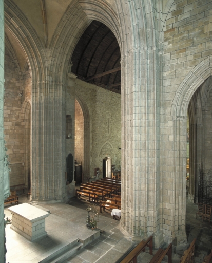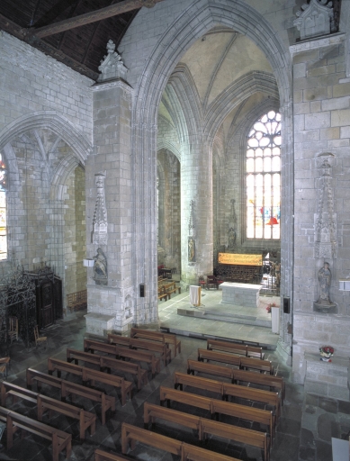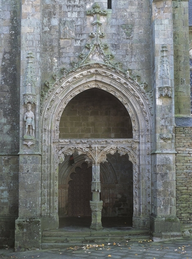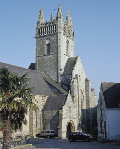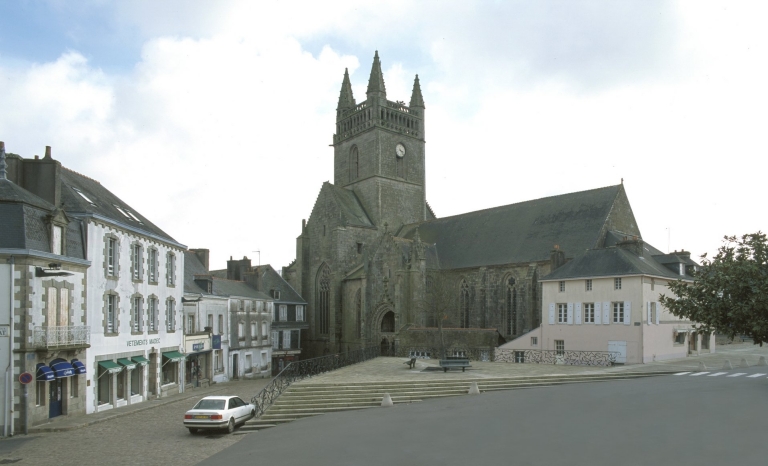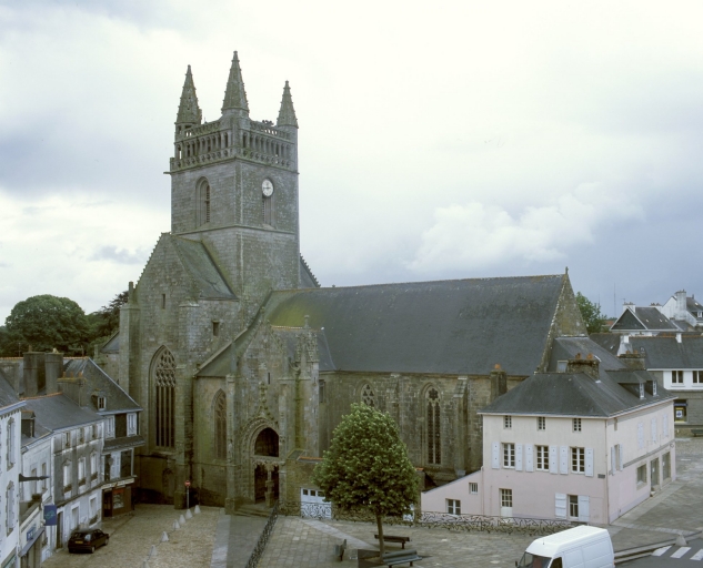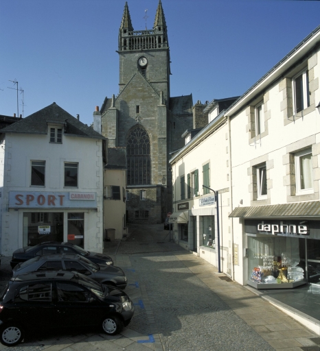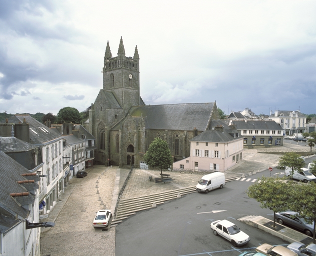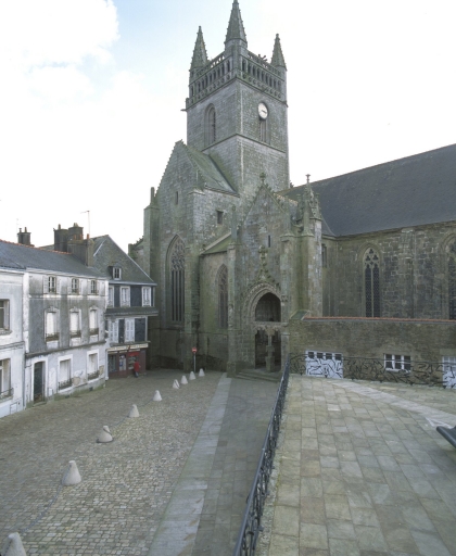 Cette ancienne chapelle de la communauté des bourgeois domine la ville haute et sa place principale destinée, depuis l´époque médiévale, aux foires et marchés. Les deux principales campagnes de construction sont immédiatement perceptibles. La partie orientale dominée par la tour massive couronnée d´une galerie ajourée cantonnée de clochetons, correspond à un seul parti architectural et montre des parentés évidentes avec les tours de la cathédrale de Quimper et des églises de Locronan, du Folgoët et de Pont-Croix. Sans égale en Bretagne occidentale, la partie orientale de l´édifice, conçue suivant un plan carré abritant la croisée faisant fonction d´avant choeur, le transept non saillant et le choeur à chevet plat flanqué de chapelles latérales, est une conséquence des contraintes de la morphologie urbaine, notamment du terrain en forte déclivité nécessitant la mise en place de contreforts puissants. Curieusement placé au nord, le grand porche, dont l´étage servait de maison commune et de lieu de réunion de la fabrique, est animé par un pilier central richement sculpté à usage de bénitier. Comme à Kernascléden, Sainte-Noyale et Saint-Fiacre du Faouët, ce porche est l´illustration d´un même modèle proposé par un atelier qui sait maîtriser harmonieusement les volumes et le décor monumental du gothique flamboyant. Le choix d´établir le porche majeur au nord, rare en Bretagne, semble indiquer la préexistence, au sud, d´un porche plus ancien déjà en place. Suite à la construction du porche nord, l´accès ouest devient alors caduc et des constructions civiles, plusieurs fois remaniées, s´appuient contre le mur-pignon. Réalisation majeure de l´art gothique en Cornouaille, cette grande église urbaine, à travers la monumentalité et la qualité décorative de sa partie orientale, illustre bien, en ce début du 15e siècle, l´impact du mécénat ducal auquel s´associe celui des autorités ecclésiastiques et civiles dont témoigne l´omniprésence de décors héraldiques.