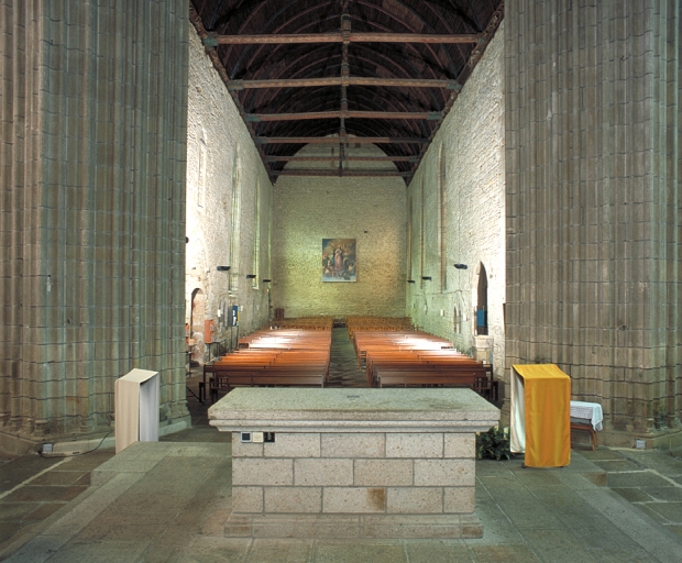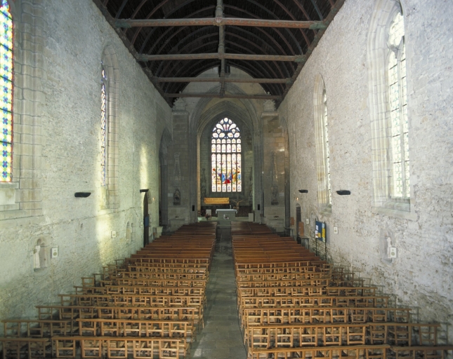 Nef, bras du transept et choeur couverts de toits à longs pans et pignons découverts. Clocher en charpente couvert d´un toit en pavillon entouré d´une plate forme flanquée de quatre clochetons. Mise en oeuvre de granites différents suivant les périodes. Porche sud avec remploi d´éléments sculptés. A l´est, larges contreforts percés de passages. Nombreuses reprises (porches, nef, croisée). Lambris de couvrement (nef) ; voûtes d´ogives (partie orientale et porches). La pièce située au-dessus du porche nord dont une baie donne directement sur la chapelle latérale nord, est accessible par un escalier en vis dans oeuvre. Au sud, un autre escalier en vis donne accès à un escalier droit dans oeuvre qui rejoint une autre vis qui, placée dans l´angle sud-ouest de la tour, dessert successivement l´espace situé au-dessus des voûtes de la croisée du transept, la chambre des cloches et la plate forme de la tour. Le massif de la tour, de plan carré jusqu´au niveau de la chambre des cloches, de plan octogonal ensuite, porte l´amorce d´une flèche maçonnée (non réalisée) dont témoignent quatre trompes plein-cintre appareillées en rouleaux à ressauts. Contreforts nord-est et sud-est percés de passages.