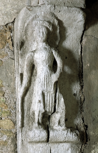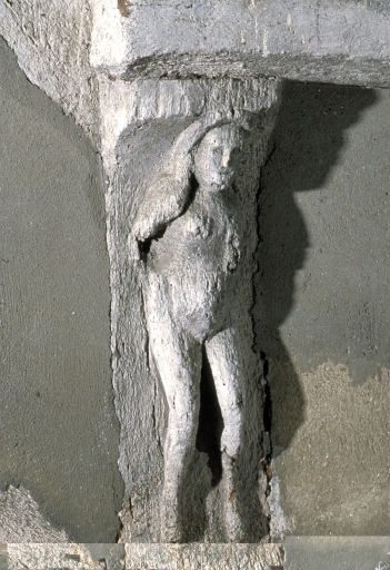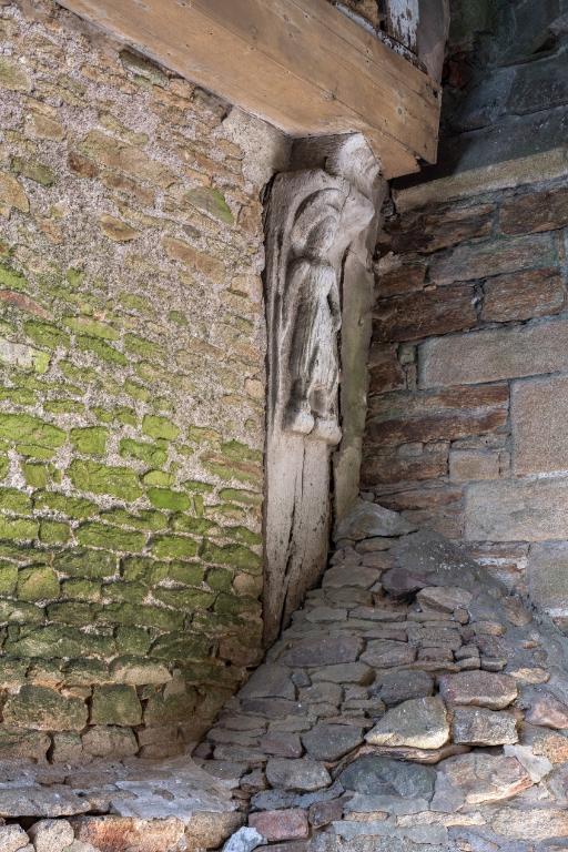 Des sculptures ornent la façade sud : un personnage nimbé avec une lance représentant Saint-Michel (?) sur un poteau du rez-de-chaussée, une femme nue pouvant symboliser Eve sur un potelet et un ange avec les armoiries de Bretagne (hermines) sur l'un des poteaux de l'étage.