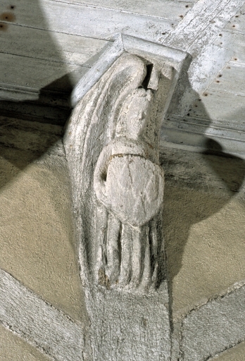 Un potelet et deux aisseliers portent un décor sculpté figurant une femme nue, un ange présentant les armoiries de Bretagne et un personnage nimbé tenant une lance, vraisemblablement un saint Michel.