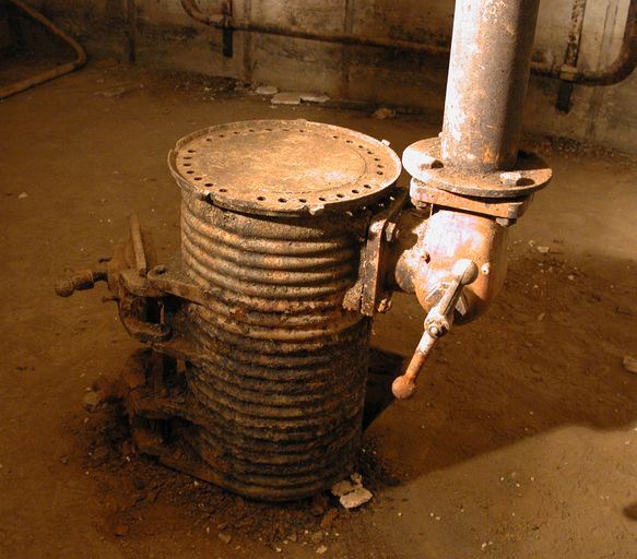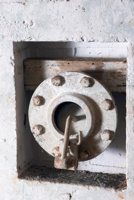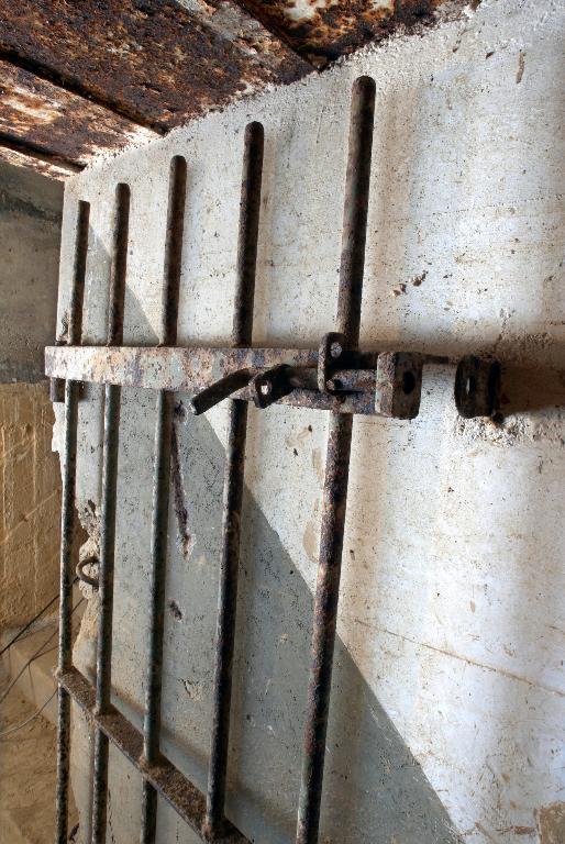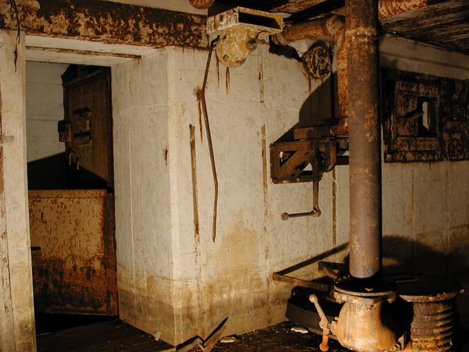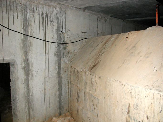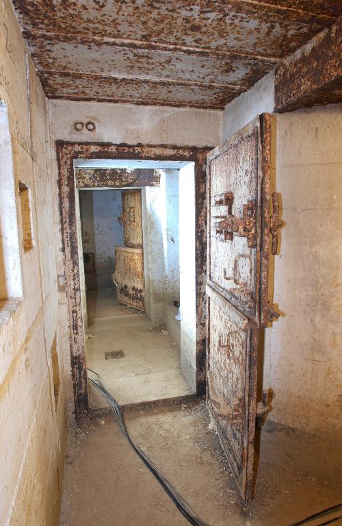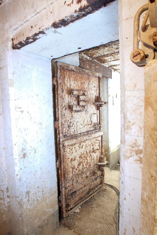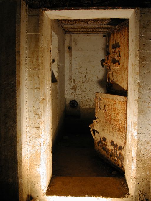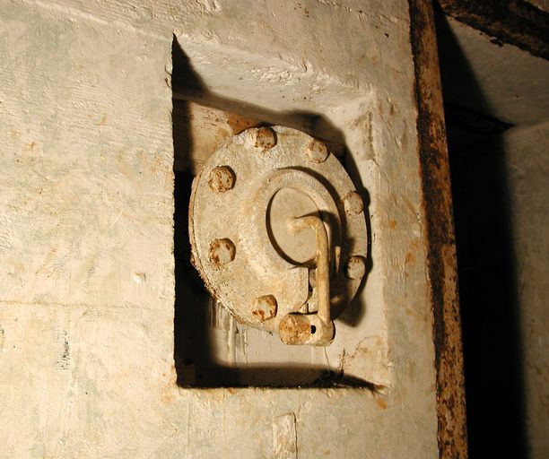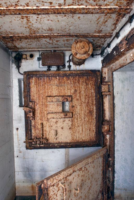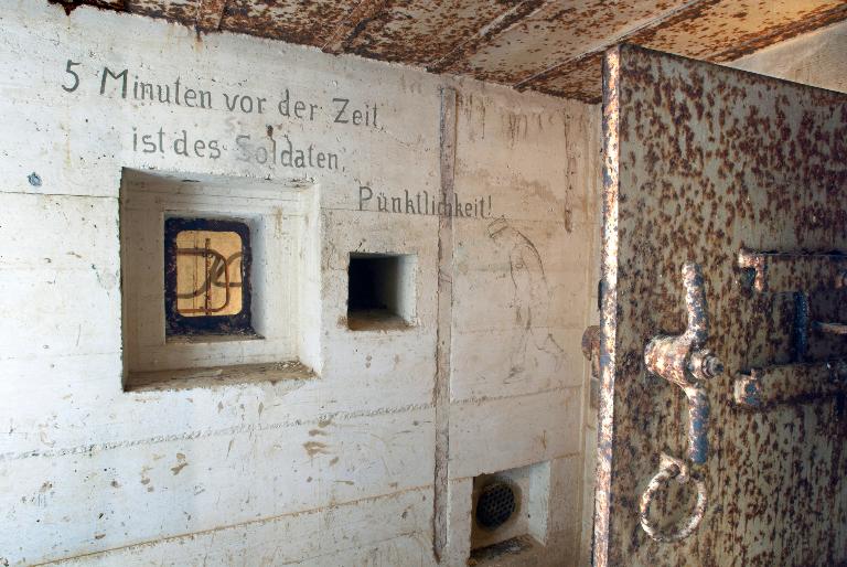 - d’un sas d’entrée à deux ouvertures flanquées chacune par une caponnière blindée de type 422 P01 pour mitrailleuse (Maschinengewehr, souvent abrégé en M.G.) et deux portes blindées lourdes à deux vantaux de type 434 P 01 avec guichet observateur (portes pare-souffle de 630 kg permettant de sortir même en cas de comblement partiel de l’entrée par des gravats). Le sas est doté de clapets de surpression (type 4 ML 01) et d’une bouche de soufflage pour la ventilation ;
