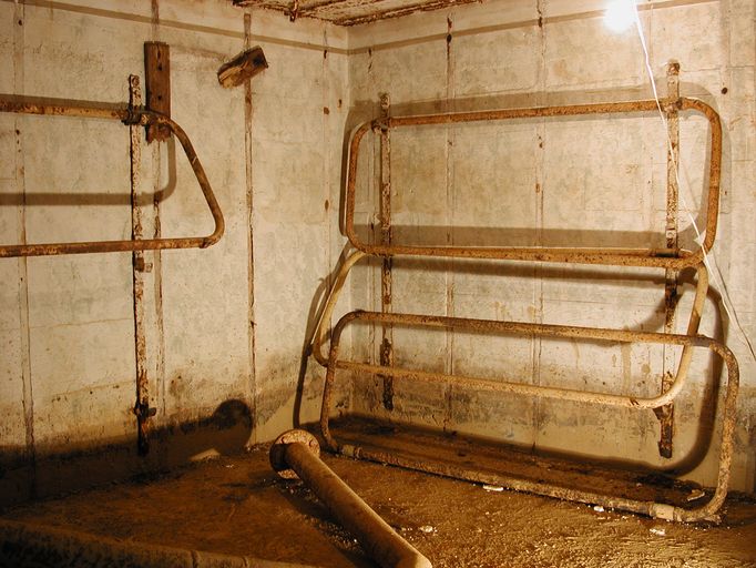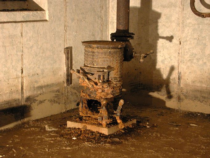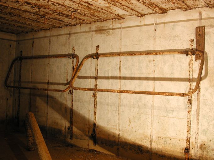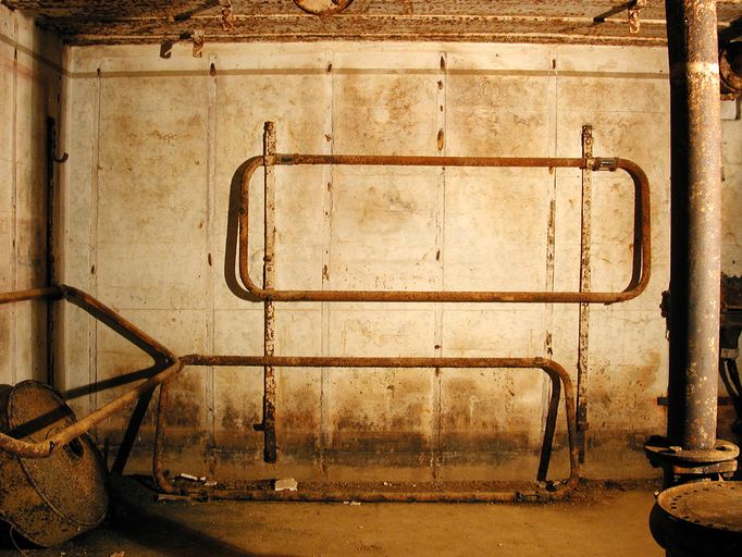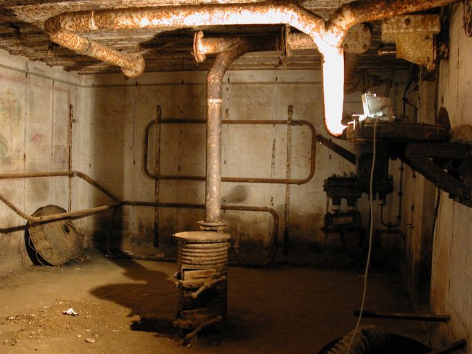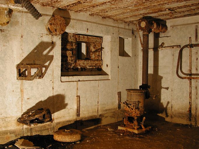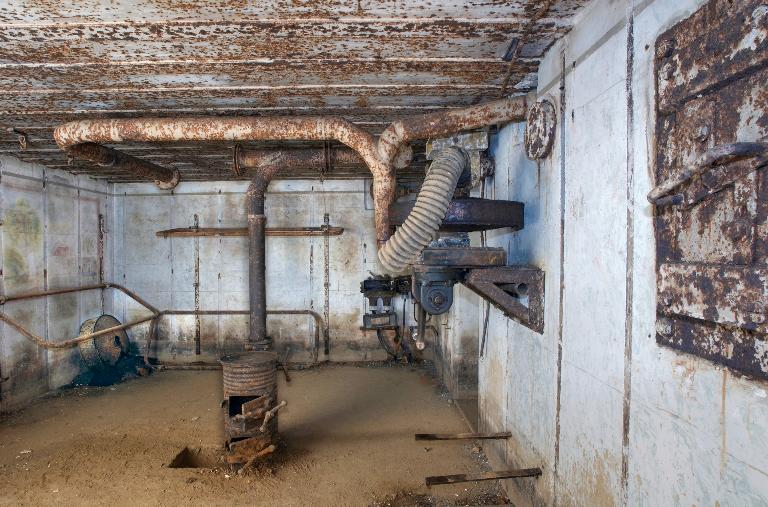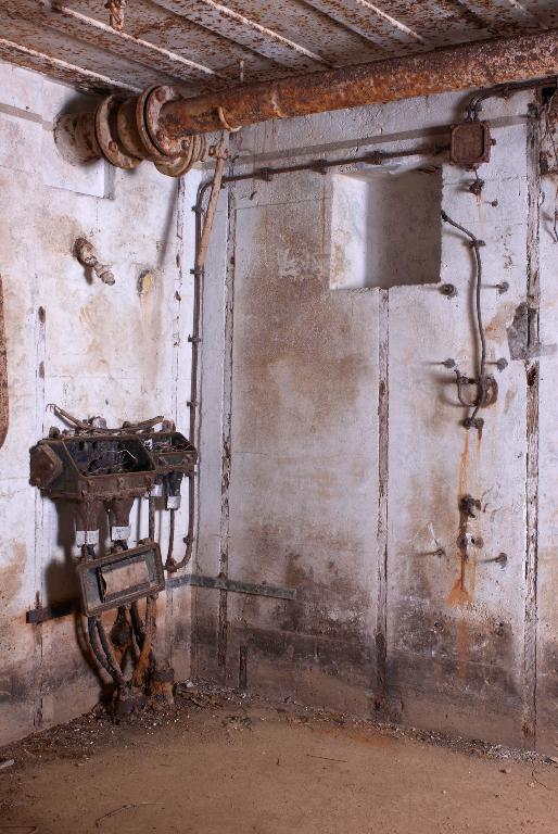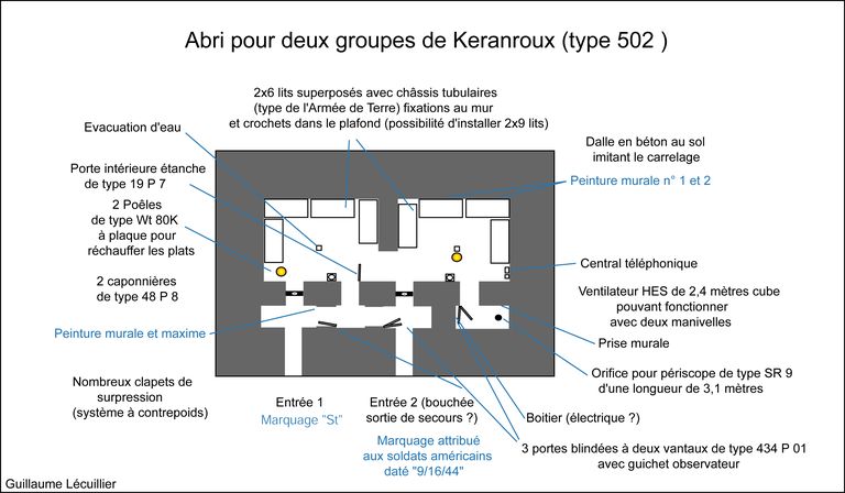 - de deux pièces de vie pour 6 hommes (transformables pour 9 hommes) ; les deux pièces sont dotées du même équipement à l’exception du boîtier de relais téléphonique ; une dalle en béton au sol imite un carrelage pour donner une impression de confort aux occupants ; une arrivée et une évacuation d’eau ; une installation électrique et un éclairage conformes au standard en vigueur ; un poêle (à bois et charbon) de type Wt 80K [pour Kochplatte] à plaque pour faire la cuisine et réchauffer les plats ; un ventilateur d’air (Heeres Einheits Schultzlufter : HES) de 2,4 m³ modèle 1940 pouvant fonctionner manuellement (deux manivelles) [pour la pièce de droite] [un ventilateur d’air de 1,2 m³ dans la pièce de gauche] ; 6 lits avec châssis tubulaires (type 922 S4), fixations au mur et crochets dans le plafond ; une table et des tabourets pliants (disparus) ; un râtelier d’armes ; un boîtier de connexion des lignes téléphoniques [Kabelendverschluss] (les plaques des numéros de ligne sont encore en place) ;