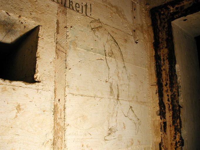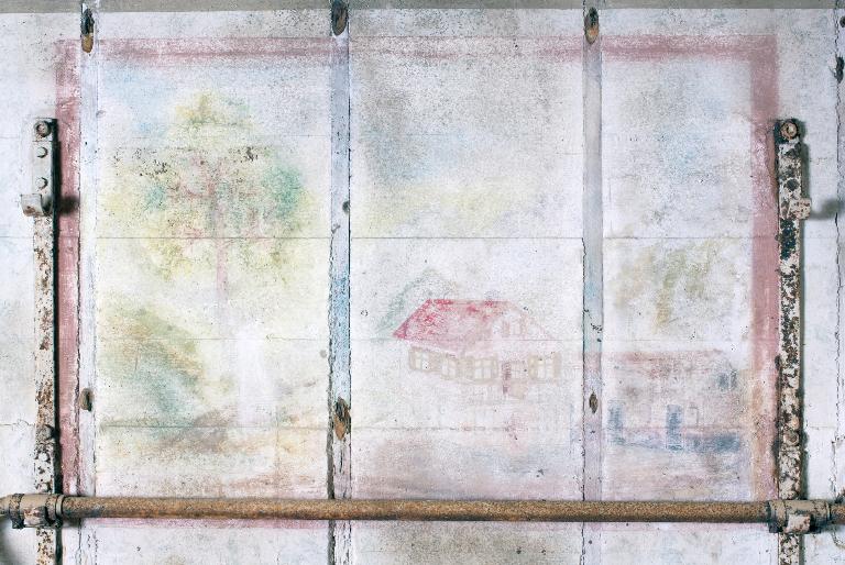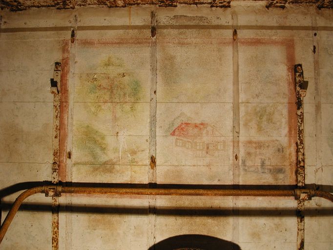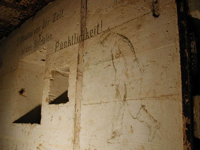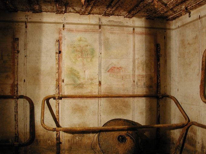 Seconde caractéristique, les murs du bunker comptent plusieurs peintures murales réalisées par les soldats allemands. Si la peinture murale à l’entrée du bunker (représentation d’un soldat allemand "traînant la patte…, une savate au pied") illustre une maxime : "5 minutes avant l’heure, c’est la ponctualité du soldat (5 Minuten vor der Zeit, ist der Soldaten, Pünktlichkeit !)", les peintures placées au-dessus des deux couchettes évoquent un paysage de Bavière (probablement la région d’origine d’un des soldats).