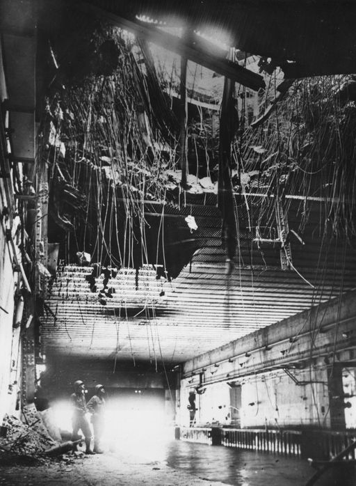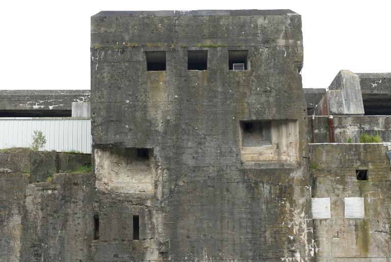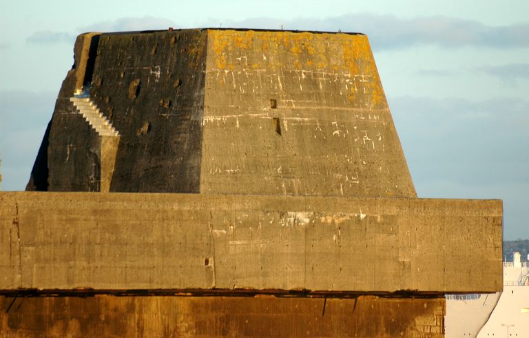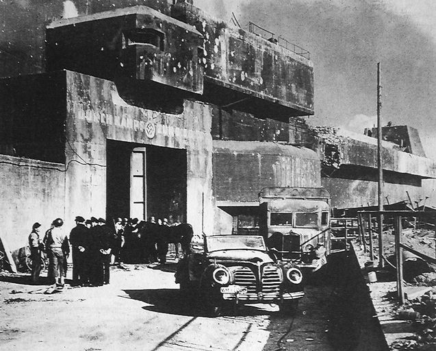 Dans une ville soumise au feu du ciel, la « cathédrale de béton » semble être le seul refuge viable. L’idéologie nazie sert de ciment à la population de la base. C’est à cause de la présence des bases de sous-marins que les villes sont bombardées mais, paradoxalement, il n’y a que les bases qui survivent à l’enfer... Les habitants se terrent dans les caves et les abris de la défense passive tandis que les batteries antiaériennes de la base de sous-marins sont mises en action. C’est le seul signe perceptible d’activité du blockhaus depuis l’extérieur. La base comprenait des stations de pompage pour vider les alvéoles, des ateliers, des magasins, des bureaux, des chambres individuelles et collectives pour les équipages et le personnel d’entretien. Une fois les lourdes portes blindées fermées, que ressentait-on à l’intérieur de ces bases ? En fait, sous la chape de béton, l’arsenal continuait de vivre : les ateliers avitaillaient et réparaient les sous-marins sous lumière artificielle. La base dispose de sa propre centrale électrique. Selon le Kampfanweisung de la forteresse Brest, trois tours de défense antiaérienne Flaktürme pour canons de 2 cm Flakvierling 38 sont en construction en mars 1944 tandis que de nombreux créneaux de tir ont été aménagés sur le pourtour de l’ouvrage. Un poste de commandement équipé d’un appareil de radio-détection a été aménagé sur le toit dans l’angle sud-est. Pour lutter contre les bombardements aériens, la dalle de couverture de 3,5 m d’épaisseur est portée à 6 m et dotée de chambres d’explosion dites structures Fangrost. Le but est de faire exploser les bombes au-dessus du toit. Ces chambres d’explosion ne couvrent cependant pas la totalité de la base en septembre 1944. Seules les bombes géantes de type Tallboy de 5 t larguées à 40 000 pieds parviendront à percer, à cinq reprises, la carapace de béton alors que des travaux d’agrandissement de la base étaient en cours. Le dernier des sous-marins à appareiller de Brest est l’U256, le 4 septembre 1944, pour Bergen en Norvège.