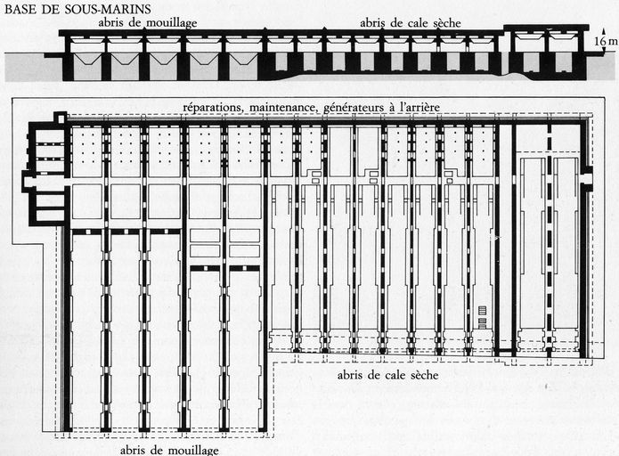 En fonction du nombre de sous-marins qu’elle est censée accueillir, l’architecture de la base est déclinée en alvéoles. Brest en compte 15, Lorient 21 (réparties sur trois ouvrages), Saint-Nazaire 14, La Pallice 10, Bordeaux 11. La hauteur moyenne des bases est de 18 m. Facile à agrandir, selon les souhaits de ses concepteurs, la base devait être modulable. Afin d’économiser l’acier et le béton, des alvéoles doubles de mouillage – à flot – sont conçues. L’alvéole est le seul lien entre le blockhaus et la mer ; un bateau-porte en l’isolant peut la transformer en cale sèche. La base est reliée à la terre par la voie ferrée qui la traverse longitudinalement. Des ponts roulants permettent des manutentions aisées. Véritable colonne vertébrale, la voie ferrée doit approvisionner la base qui est conçue comme une « ville-arsenal ». De chaque côté de cette ligne de communication avec le monde extérieur, on trouve, côté mer, les alvéoles et les sous-marins, côté terre, les ateliers, logements et espaces de vie. L’industrialisation des procédés de la guerre semble avoir déteint sur les hommes.