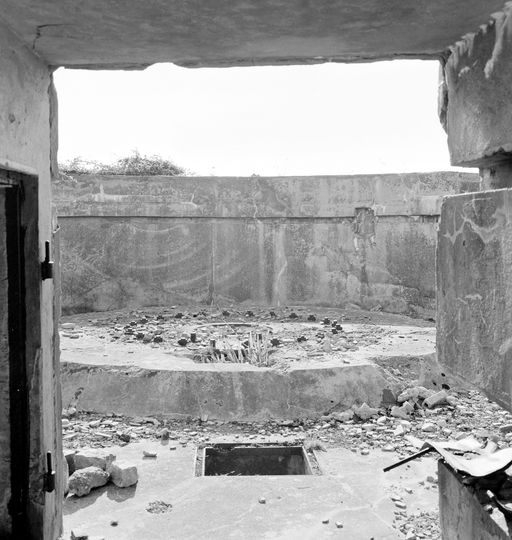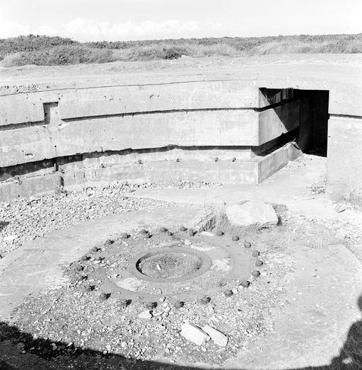 Poste de télémétrie (7) local rectangulaire à l'arrière, hémicylindrique à l'avant surélevé par rapport aux autres locaux du bloc ; large fente de visée en demi-cercle ; dans le sol : goujons de scellement d'embase d'appareil.