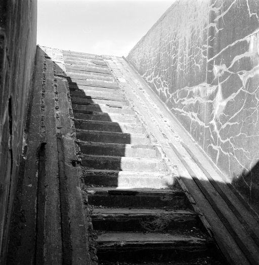 - Cet escalier aboutit dans la paroi nord-est de la cour d'entrée entre deux locaux rectangulaires (1) et (2) (soutes à carburant et ingrédient du groupe électrogène-magasin) dont les entrées font face au mur arrière du bloc proprement dit.