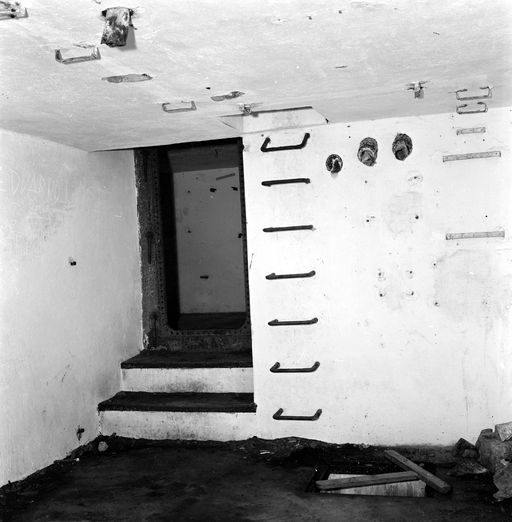 - A droite, la porte d'entrée du personnel menant aux locaux des postes de commandement. Cette porte dessert un premier vestibule (3) avec, à droite, une grande pièce rectangulaire (4) et, dans l'axe de l'entrée, une autre pièce rectangulaire (5) séparée, par piédroit percé d'une porte ; d'une seconde pièce identique (6) communiquant à la fois à l'arrière avec la pièce (4) et à l'avant avec le poste de télémètre (7). Un puits carré dans le plafond, relie le local (6) au poste d'observation (8) situé au-dessus.
