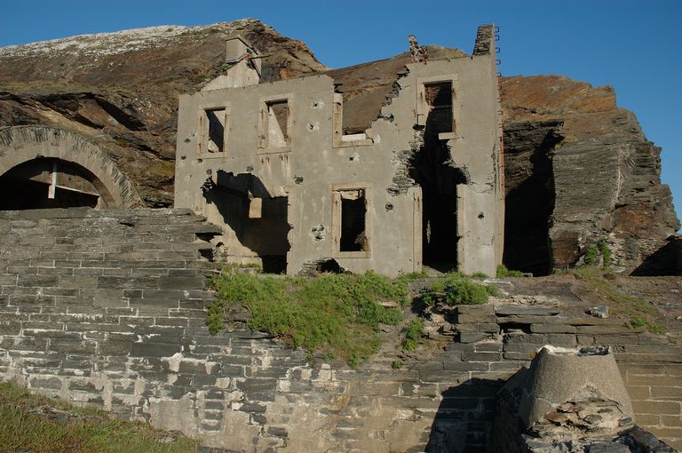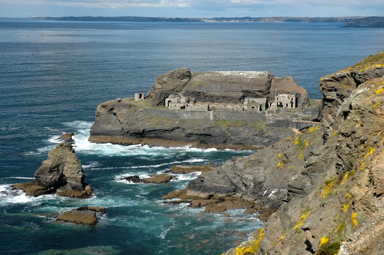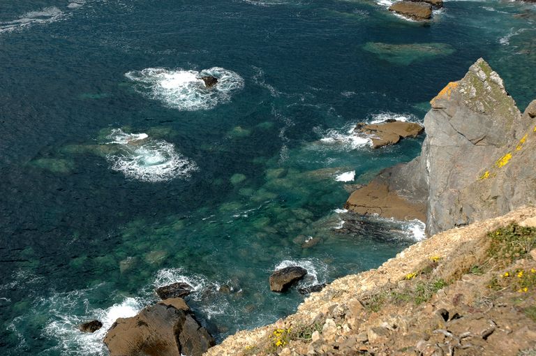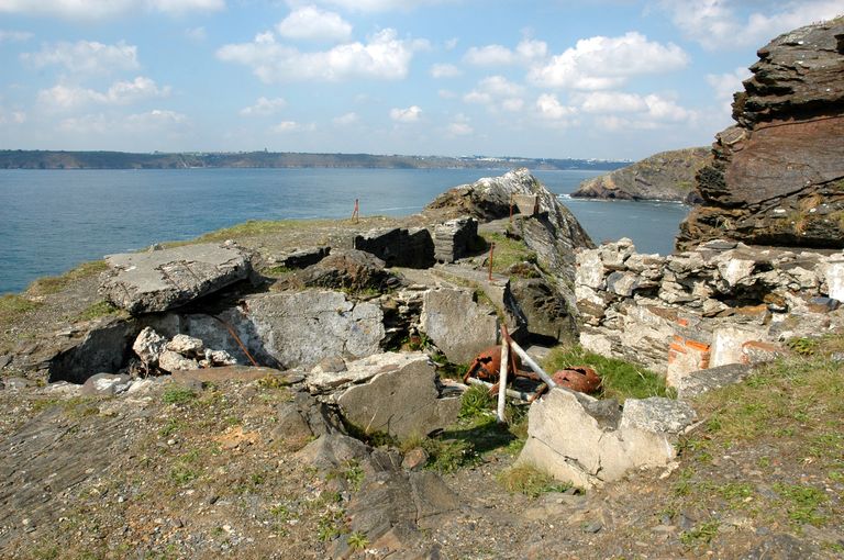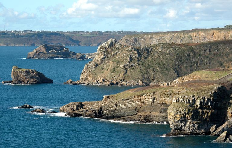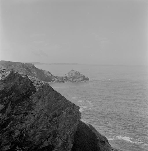 Matériau constitutif du site : falaise en schiste et quarzite de Plougastel. L'ilot est un monolithe en schiste ardoisier presque noir.