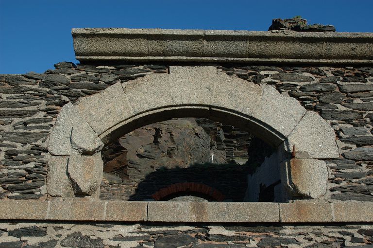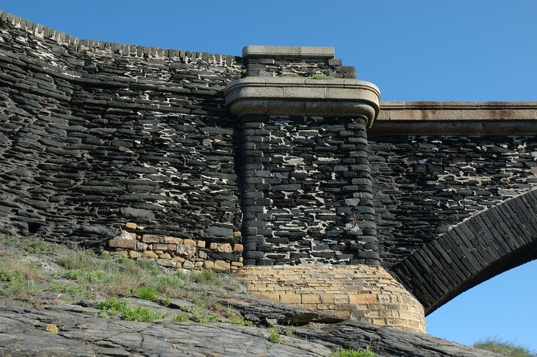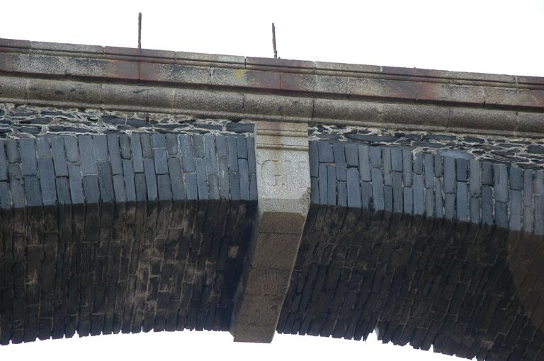 Voûte surbaissée en schiste. Têtes saillantes appareillées à deux rangs de claveaux à joints contrariés. La clé est constituée par un monolithe de granite clair portant gravée, sur la face d'extrémité nord "GM" (génie militaire) et sur la face sud "1861" surmontée de deux moulures.