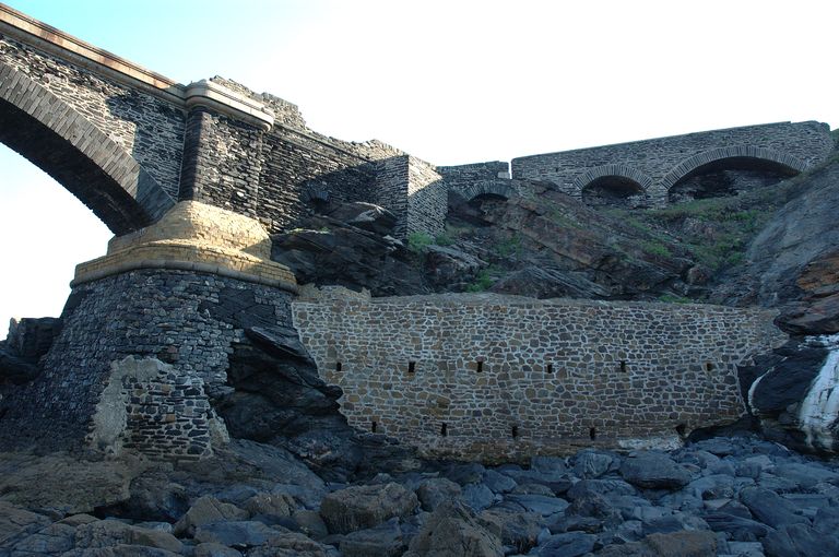 Mur vertical droit en maçonnerie de schiste se terminant à chaque extrémité par un retour hémicylindrique, prolongé (sur la rive continentale seulement) par des bajoyers en maçonnerie. Un peu au dessous du sommet de l'embase, l'ensemble est ceinturé par un boudin hémicylindrique en granite appareillé. Après un ressaut à plan incliné, l'embase porte, en retrait, un massif, également en maçonnerie, servant d'assise à la culée proprement dite.
