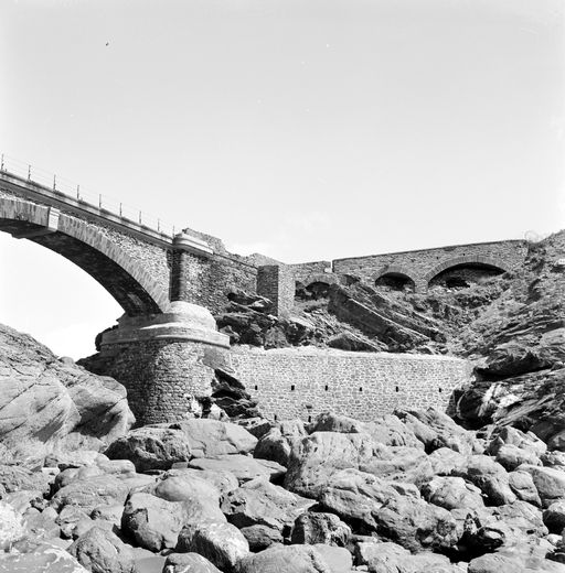 Chaussée d'accès protégée par murs de soutènement et arceaux de décharge dans le dernier tronçon avant le pont ; elle est bordée de parapets en maçonnerie. Tracé tortueux avec de fortes rampes, à cause du caractère tourmenté du site.