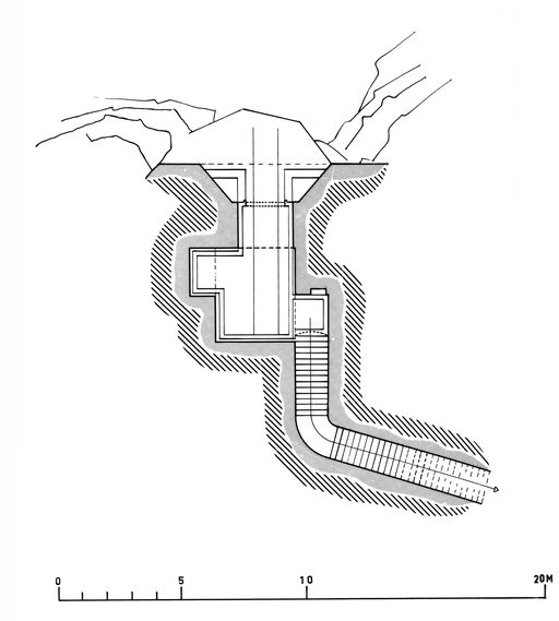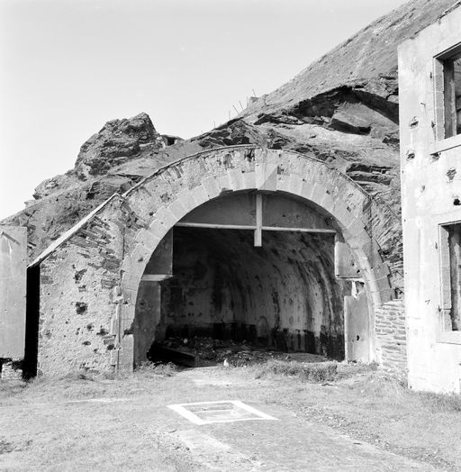 - Du vestibule nord part un tronçon de galerie menant à un puits vertical, autrefois équipé d'un monte-charge (disparu) et débouchant - comme l'escalier - sur la route en tranchée desservant les ouvrages (route jadis équipée d'une voie ferrée étroite).