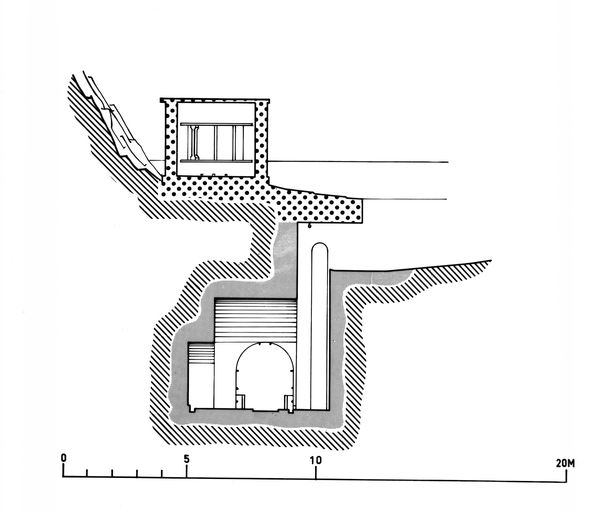 Bâtiment du temps de paix (magasin) en maçonnerie et toiture terrasse à l'extrémité droite, défilé par le massif de terre prolongeant le parapet de batterie.