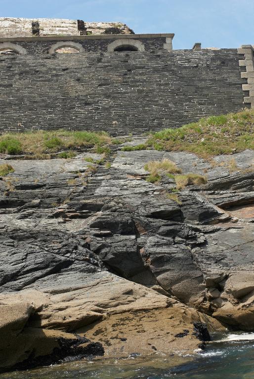 Essentiellement sur la partie arrière (non exposée aux feux des navires de ligne), elle est constituée par un parapet en maçonnerie surmontant une escarpe à tracé irrégulier et brisé. Du côté de l'entrée, l'escarpe est construite en retrait du bord de l'îlot, de façon à dégager la plate-forme extérieure d'entrée, séparée du mur d'enceinte par un petit fossé qui franchit le pont-levis d'entrée.