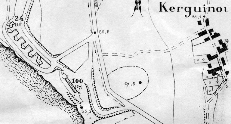 Une photo aérienne, prise en 19... montre, en position, 3 pièces Marine modèle 1870-1887 sur affût modèle 1888 P.C. (renseignement confirmé par les goujons de sellette encore en place).