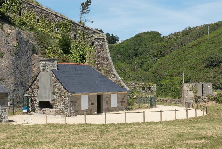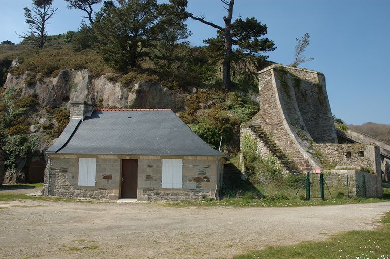 Sur les huit bâtiments construits sur le terre-plein de la batterie basse (casernes et magasins) en 1807, trois bâtiments en alignement orientés est-ouest (corps de garde, remise et magasin à poudre) et adossés à la falaise, subsistent. Le plus remarquable, situé à l’extrémité est, consiste en un bâtiment couvert à deux pans à coyaux en ardoises et renseigné en 1696 comme "logements des canonniers, halle et corps de garde". Deux "branches tombantes" - murs d’enceinte percés de créneaux de mousqueterie et escaliers en parallèle - ferment les flancs à l’est et à l’ouest. Deux pont-levis à flèches permettaient d’accéder aux batteries haute et basse. Un magasin à poudre a été aménagé dès la fin du 17e siècle dans la falaise.