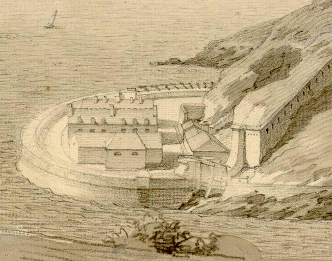 "Les plans et profils de celle-ci [la batterie du Léon] feront voir à votre Majesté en quoi doit consister sa fortification, qui ne sera autre qu’un petit camp assez bien retranché pour ne pouvoir être pris d’emblée, ce qui donnera loisir de prendre le parti que l’on voudra. Le Mengant ou batterie de Léon est déjà fermé par une muraille, et son derrière gardé par une redoute de maçonnerie à mâchicoulis, qui serait de très peu de résistance contre du canon à terre ; les deux communications ne sont point terrassées et n’ont que peu de fossé, non plus que la redoute ; les montagnes (A-B) plongent tellement sa batterie basse qu’il y serait impossible de pouvoir y demeurer si l’ennemi s’en était emparé ; on y remédiera, si votre Majesté l’agrée, pour occuper toute la hauteur (A) d’un ouvrage couronné et, à l’égard de l’autre (B), on trouvera moyen de garantir ladite batterie par la manière de placer les bâtiments dont elle a besoin et par y ajouter quelques traverses […]. Il y a 50 et 4 pièces dans les deux batteries du Mengant dont les moindres sont de 18 livres de balle et les plus grosses de 36 et de 24", Vauban, 15 juillet 1695.