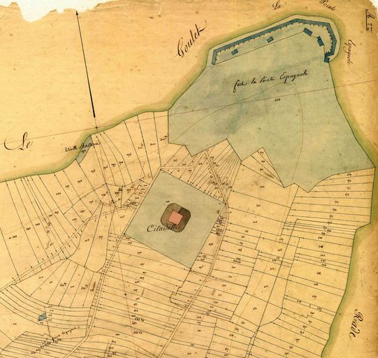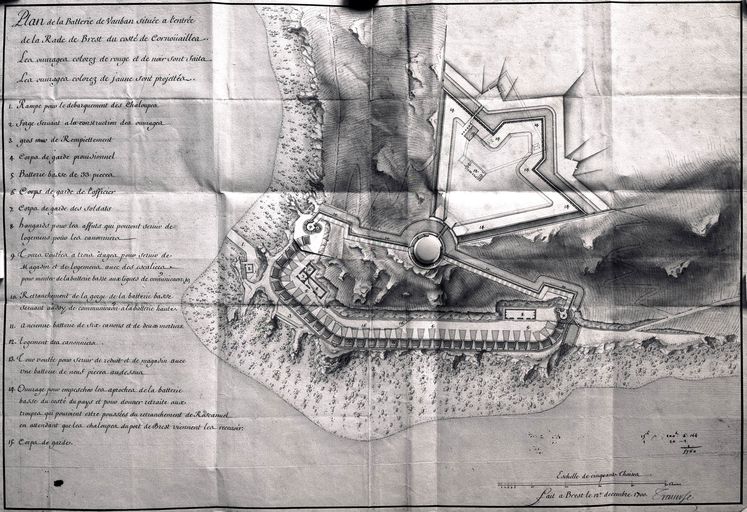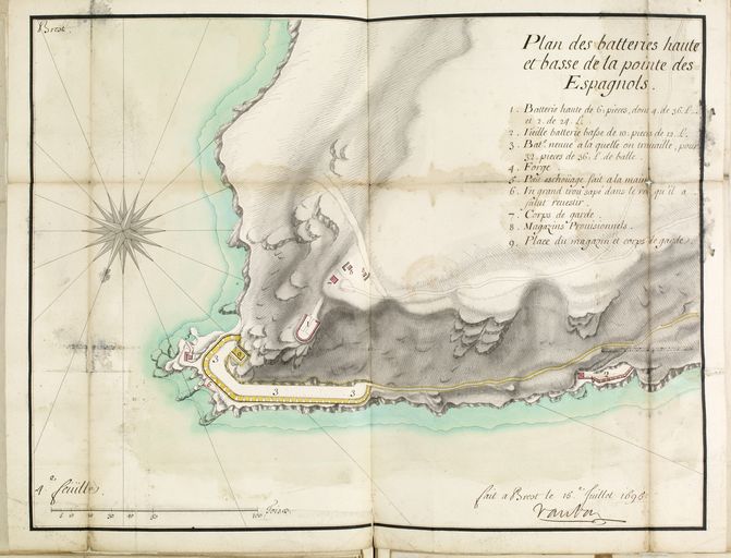 Collection Nivart. MS144_225. Plan du fort de la pointe des Espagnols : batteries faites et à faire, fin du 17e siècle, par Du Mee, aide d´artillerie. Fin du 17e siècle.Plan, support papier, 0,661 x 0,501 mètre, 4e quart 17e siècle.