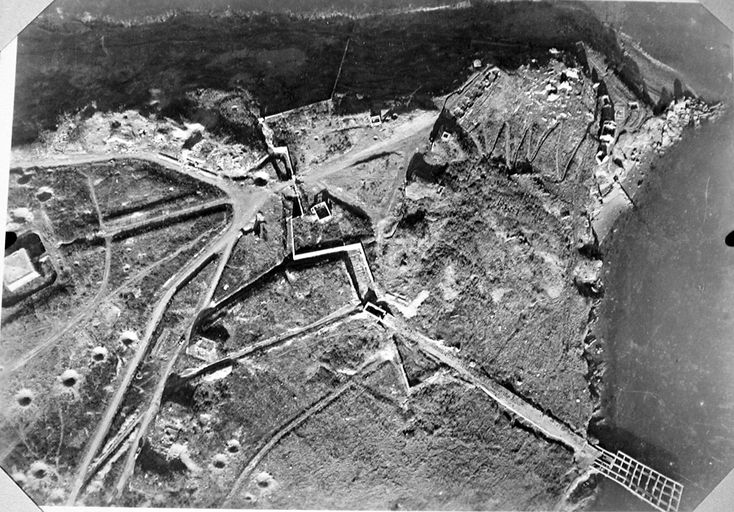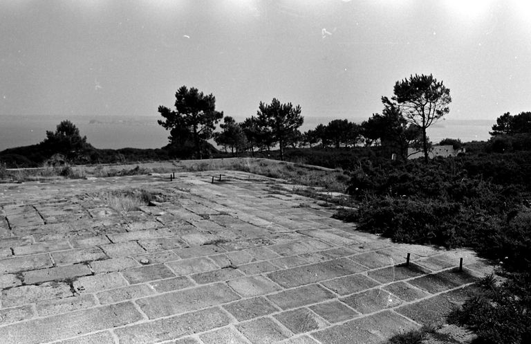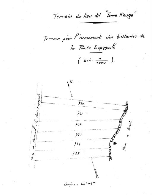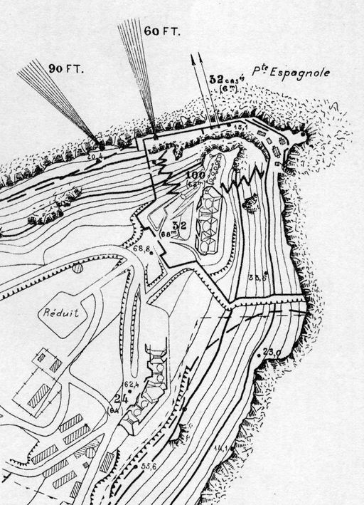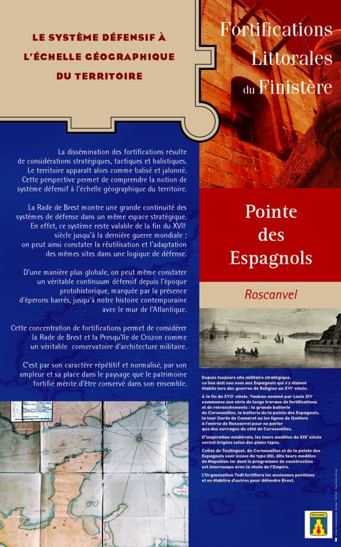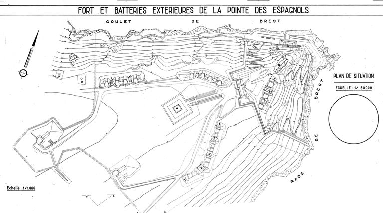 Fonction : défense du goulet et de la rade de Brest en collaboration avec les batteries du Portzic. Armement des batteries haute et basse de la pointe des Espagnols : A la fin de l'année 1695, la batterie haute était armée de 6 canons (4 canons de 36 livres de balle, 2 canons de 24 livres de balle) ; la vieille batterie basse (légèrement plus à l'ouest de la nouvelle batterie) était armée de 10 canons de 12 livres de balle. La nouvelle batterie basse en construction conçue pour acceuillir 30 canons de gros calibre comporte déjà 24 canons de 36 livres de balle dont 17 en cours d'installation. Elle apparaît toujours en "chantier" fin 1700 sur le plan de l'ingénieur Traverse. Le 7 novembre 1844, le comité des fortifications s'appuyant sur le travail de la commission des côtes de 1841 (Atlas de défense des côtes, tome III, 2e arrondissement de Brest) recommande l'armement de la batterie : 20 canons de 30 livres de balle modèle 1840 sur affûts pivotant et obusiers de 22 cm modèle 1827 sur affûts de fer pivotant et 5 mortiers de 32 cm en fer. La batterie de la pointe des Espagnols est mentionnée dans l'Atlas de 1858 de mise en état de défense des côtes de l'Empire Français (n° 230). Classée en 1er degré d'importance, elle est armée de 10 canons de 30 livres de balle modèle 1840 sur affûts pivotant, 10 obusiers de 22 cm modèle 1827 sur affûts de fer pivotant et 4 mortiers de 32 cm. Selon l'état extrait de la délibération de la Commission de Défense des Côtes en date du 7 février 1870 et annexé au projet d'instruction pour la révison à faire à l'armement du littoral, l'armement transitoire antérieur à 1870 est composé de : 18 canons rayés de 30, 2 obusiers de 22 cm rayés et frettés et 4 mortiers de 32 cm. Selon l'état extrait de la délibération de la Commission de Défense des Côtes en date du 7 février 1870 et annexé au projet d'instruction pour la révison à faire à l'armement du littoral, on préconise comme armement transitoire proposé en 1970 : 4 canons rayés de 27 cm, 10 canons rayés de 30, 2 obusiers rayés et frettés de 22 cm et 4 mortiers de 32 cm. Stockage des poudres : - Deux magasins à poudre terrassés de type 1874 construits en 1882-1883, établis en arrière de la position. - Un magasin à poudre sous roc de grandes dimensions construit vers 1890-1893. Une batterie de 4 canons Marine de 47 mm modèle 1885 à tir rapide sur affûts Marine modèle 1885 à crinoline est installée sur la plate-forme de la batterie basse en 1893. Selon l'Atlas des batteries de côte de 1893, les batteries hautes et basse de pointe des Espagnols sont armées de : - 4 canons Marine de 47 mm modèle 1885 à tir rapide sur affûts Marine modèle 1885 à crinoline ("batterie basse", cote : 4,70 mètres) ; - 4 canons Marine de 19 cm modèle 1864-1870 sur affûts Marine modèle 1869-T-1884 P. A. ("batterie extérieure de gauche", cote : 64,93 mètres) ; - 4 canons Marine de 24 cm modèle 1870 sur affûts Marine modèle 1876-T-1883 ("batterie extérieure de droite", cote : 64,93 mètres) ; - 4 canons Marine de 24 cm modèle 1870-1884 sur affûts Marine modèle 1876-T-1883 (cote : 74,24 mètres) ; - 3 canons Marine de 32 cm modèle 1870 sur affûts Marine modèle 1876-T-1883 P. A. ("batterie intérieure", cote : 67,19 mètres) ; - 4 canons Marine de 32 cm modèle 1870-1881 sur affûts Marine modèle 1882 P. A. ("batterie extérieure de droite du goulet", cote : 70,50 mètres). - 2 canons Marine de 32 cm modèle 1870-1884 sur affût Marine modèle 1888 ("batterie de rupture", cote 6 mètres) ; Selon l'Atlas des batteries de côte de 1913, les batteries hautes et basse de pointe des Espagnols sont armées de : - 4 canons Marine de 100 mm modèle 1897 à tir rapide sur affût Marine modèle 1897 P. C. (cote : 63 mètres) ; - 4 canons Marine de 24 cm modèle 1870 sur affûts Marine modèle 1876-T-1883 ("batterie extérieure de droite", cote : 64,93 mètres) ; - 3 canons Marine de 32 cm modèle 1870 sur affûts Marine modèle 1876-T-1883 P. A. ("batterie intérieure", cote : 67,19 mètres) ; - 2 canons Marine de 32 cm modèle 1870-1884 sur affût Marine modèle 1888 ("batterie casematée" ou "batterie de rupture", cote : 6 mètres). Selon l'Atlas des batteries de côte de 1922, les batteries hautes et basse de pointe des Espagnols sont armées de : - 2 canons Marine de 100 mm modèle 1881 à tir rapide. (cote : 63 mètres) ; - 4 canons de 75 mm en défense antiaérienne.