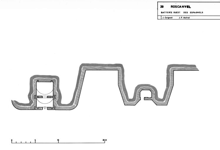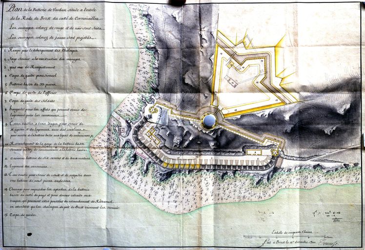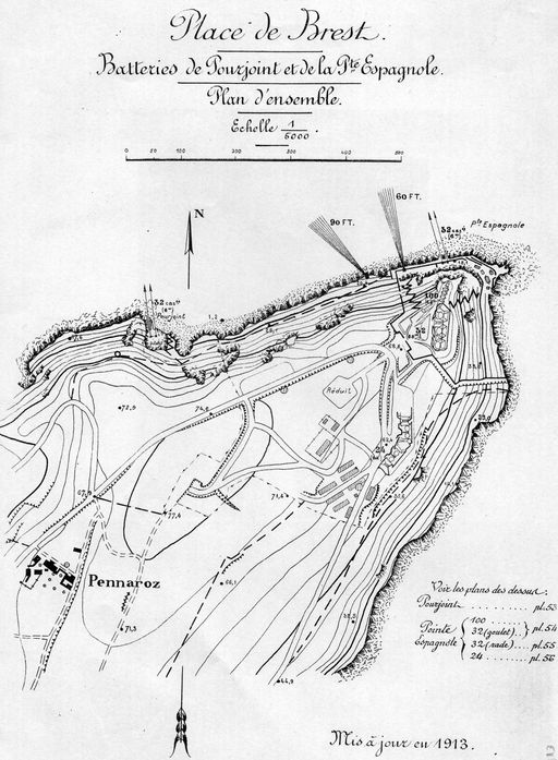 PETER (J), préface de Jean Meyer, Vauban et Brest. Dossier. Une stratégie modèle de défense portuaire, 1683-1704, Paris, Economica et Institut de Stratégie Comparée, 1998, 320 p. "Le 11 mars 1689, Vauban proposait de faire un fortin à la pointe des Espagnols avec une tour à l´extrémité qui servirait de batterie. Située sur un promontoire à l´extrémité de la presqu´île de Roscanvel vis-à-vis du fort du Portzic, la batterie de la pointe des Espagnols qui dominait toute la rade et l´embouchure du goulet de Brest, était la dernière fortification sur la rive Sud du goulet avant l´entrée de la rade. Elle croisait ses feux avec celle du Portzic" ; "La batterie basse a été construite à la mine au pied de l´escarpement à l´endroit le plus resserré du goulet". Le 10 mai 1695, Le Peletier écrivait à Vauban : "Il n´y a pas de fonds pour la batterie basse des Espagnols, où il y a déjà 10 canons" (Génie, article 8, section 1 : Brest, carton n° 1, n° 34). Le 29, Le Peletier avait trouvé Pontchartrain inexorable concernant la batterie de la pointe des Espagnols "qu´il fallait établir sur le roc". Le coût serait d´au moins 20 000 livres. "Il y a beaucoup d´escarpements à faire". En juin, Vauban faisait travailler avec beaucoup de vigueur à la nouvelle batterie de la pointe des Espagnols, "pièce de très grande conséquence, qui battra presque également sur le goulet et la rade à 10 toises au-dessus du rivage. Le roc y est dur comme du diamant et ce n´est que par la poudre qu´on en vient à bout. Je compte y mettre trente pièces de canon, mais elle ne pourra être achevée que vers la fin d´octobre". Selon le plan de Vauban du 15 juillet 1695, la batterie de la pointe des Espagnols comprenait : 1. Une batterie haute de six canons dont quatre de 36 livres et deux de 24. 2. Une vieille batterie basse de dix canons de 12 livres. 2. La nouvelle batterie de vingt-quatre canons de 36 livres à laquelle on travaillait, ainsi qu´un corps de garde, un magasin et une forge (Génie, F°33, tome 2). Armement de la batterie de la pointe des Espagnols en décembre 1695 : Batterie haute : 6 canons (4 de 36 livres, 2 de 24). Vieille batterie basse : 10 canons (Tous de 12 livres). Nouvelle batterie basse : 24 canons (Tous de 36 livres ; dont 17 en voie d´installation ; batterie conçue pour recevoir 30 gros canons). D´après le plan de Traverse du 24 janvier 1696 de la nouvelle batterie de la pointe de Espagnols, les huit premières plate-formes du côté gauche de la batterie étaient faites. Restaient à faire les vingt-deux autres pour porter la nouvelle batterie basse à trente canons, ainsi que les magasins et les logements. La batterie occupait un espace d´environ 90 toises en longueur (Génie, article 8, section 1 : Brest, carton n° 1, n° 32). Une fois équipée de quarante-neuf canons, la batterie de la pointe des Espagnols devait constituer, avec celle de Cornouaille, l´un des deux grands ouvrages de défenses de la presqu´île de Roscanvel. Le plan de Du Mée, aide d´artillerie, mentionnait la construction d´une tour de 10 pieds de haut pour mettre cinq ou six mortiers qui battront dans le goulet et la rade de Brest. "Actuellement, il y a une plate-forme de deux mortiers et de deux canons (Service Historique de la Marine, Vincennes : Ms 144)". En septembre 1699, Vauban écrivait à Jérôme de Pontchartrain : "Il faudra faire la même garde à la batterie de la pointe des Espagnols qu´à celle de Portzic, c´est à dire y mettre un autre canonnier et deux aides avec leurs familles avec ordre aux canonniers des milices d´accourir au signal... Près de la pointe des Espagnols, il y a une batterie de dix pièces dont il faudra mettre les pièces sur le ventre aussi bien que celles de la batterie de Vauban dont on devra faire tous les jours une fois la visite". Vauban ajoutait : "Il y a entre la batterie de la pointe des Espagnols et celle de Cornouaille une pointe de rocher fendue appelée Kergadiou qui se présente très bien à la mer pour une belle et grande batterie qui serait là très utile et très bien placée". Légende du plan de Traverse daté du 12 décembre 1700 (p. 284) "Selon Traverse, "il doit y avoir au-dessus de cette batterie une grosse tour ou redoute à trois étages de 10 pieds (3,30 mètres) de haut, couverte d´un retranchement en forme d´ouvrage couronné, avec deux lignes de communication avec la batterie basse qui seront terminées sur les extrémités de la droite et de la gauche par deux tours voûtées à plusieurs étages dans lesquelles seront les escaliers pour descendre dans la batterie basse. Ces tours pourront servir de magasins et de logements pour les troupes et les canonniers (Génie, article 8, section 1 : Brest, carton n° 1, n° 40)". Selon Traverse, cet ouvrage visait à empêcher les approches de la batterie basse du côté du pays et à fournir une retraite aux troupes qui pourraient être poussées du retranchement de Roscanvel en attendant les chaloupes". Une batterie de neuf canons était par ailleurs prévue sur la partie supérieure pour remplacer la vieille batterie de six canons".