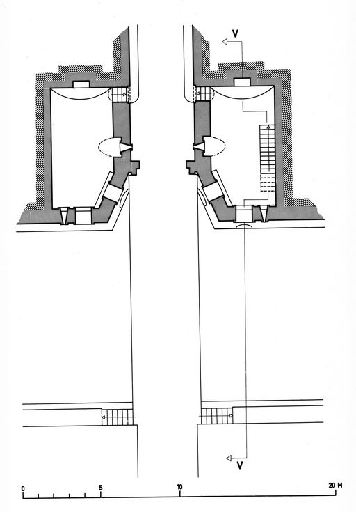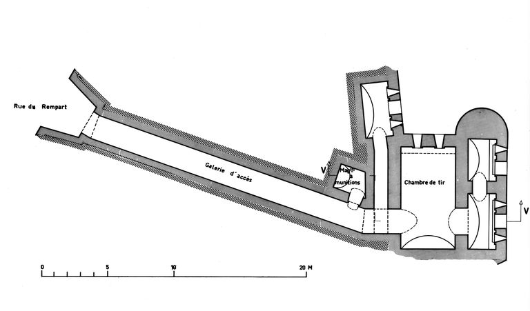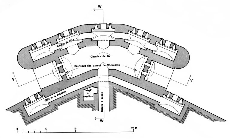 Chaque caponnière double est défendue par une galerie de fusillade de tête (10 créneaux verticaux de fusillade) et une galerie de fusillade d’escarpe (4 créneaux verticaux de fusillade), toutes deux dotées d’orifices de ventilation (une cheminée et un évent pour 2 créneaux). Ces organes défensifs sont reliés au casernement via une galerie voûtée en plein cintre.