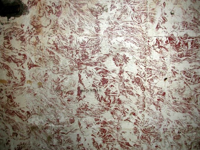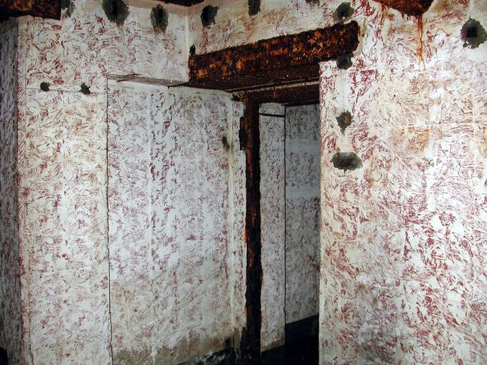 Les murs de la pièce de vie du bunker sont peints en ocre jaune tacheté, il sont délimités en partie haute et basse par une frise de couleur foncée.
