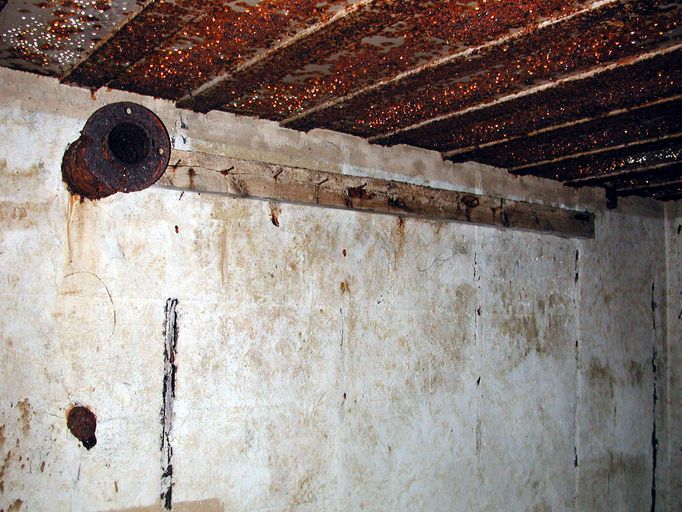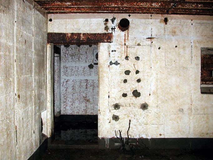 Le couloir d’entrée au bunker donne accès au sas étanche anti-gaz par lequel on accède à la fois à la pièce de vie - chambre de troupe et à la salle de ventilation. La salle de ventilation pour deux ventilateurs (une partie des tuyaux est en place) donne accès au puits de la cloche blindée et à la caponnière.