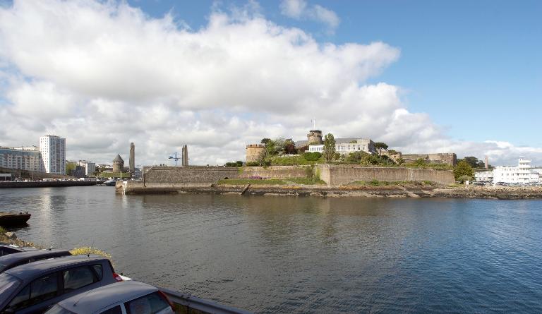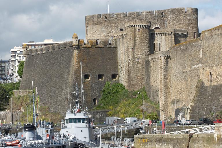 Le château médiéval et la caserne dite "caserne Plougastel" (fin du 16e siècle-début du 17e siècle) sont protégés au titre des Monuments historiques en 1923. Touché par les bombardements aériens et les combats de la Libération, le château est restauré tandis que les casernes, logements et magasins situés dans la cour sont rasés. Le château de Brest est transféré à la Marine en 1945.