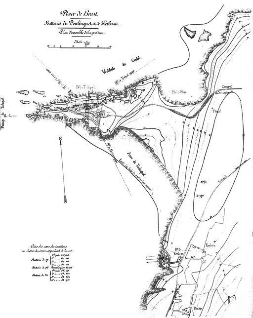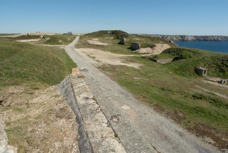Fonction : défense du mouillage de Camaret puis défense lointaine du vestibule du goulet de Brest. Dès 1694, la pointe du Toulinguet est occupée militairement, on y installe une batterie de côte et un signal. D'après l'Atlas des places fortes de France de 1784 (tome 69a : ouvrages extérieurs de Brest par De Caux) ; une batterie de côte désignée "batterie du Toulinguet" est mentionnée sur l'actuelle "pointe du Toulinguet". Elle s'intercalait entre les batteries du "Grand Gouin" et de la "pointe aux Pois". La batterie du Toulinguet est mentionnée dans l'Atlas des côtes de France 1818-1848 (tome 192 : direction de Brest). D'après l'état de 1820 et le plan de détail du lieutenant du Génie Boüevec daté de 1818, on compte au Toulinguet sept batteries de côte : - 8 mortiers de 12 pouces et 4 canons de 24 livres de balle, - 8 canons de 24 livres de balle, - 12 canons de 24 livres de balle, - 5 canons de 24 livres de balle, - 2 mortiers de 12 pouces, - 1 canon de 24 livres de balle, - 1 mortier de 12 pouces. - Une "tour-modèle n° 3" construite en 1812, - Un "corps de garde", - Un "magasin à poudre" et une "guérite". Une batterie de côte comprenant un "corps de garde" est mentionnée au lieu-dit "Penhat" ainsi qu'à la "pointe aux Pois" où il est fait mention de deux batteries de 2 pièces, d'un "corps de garde" et "magasin à poudre". Le cadastre de 1831 relève au moins sept éléments défensifs pointe du Toulinguet (apparaîssant en rosé et en bleuté) dont six batteries (cinq orientées vers le nord-ouest : le vestibule du goulet et une vers le sud-ouest : anse de Pan Hat) et le toponyme "Toullinguet". En 1841, la commission des côtes recommande l'armement de la batterie du Petit Grouin (14 "canons de 30 et obusiers de 22 en fer" ; "2 mortier de 32 en fer"). L'avis du comité des fortifications du 7 novembre 1844 confirme la décision de la commission. La batterie du Toulinguet est mentionnée dans l'Atlas de 1858 de mise en état de défense des côtes de l'Empire Français (n° 230). Classée en 2e degré d'importance, elle est armée de 7 "canons de 30", 7 "obusiers de 22" et 2 "mortiers de 32". Stockage des poudres : - Un magasin à poudre terrassé de type 1879 construit vers 1883-1884. - Un magasin à poudre sous roc construit vers 1890-1893. Selon l'Atlas des batteries de côte de 1893, les batteries du Toulinguet sont armées de : - 2 canons de 16 cm ; - 4 canons Guerre de 19 cm modèle 1875-1876 sur affût G.P.C. (cote : 52,40 mètres) ; - 4 canons de 24 cm modèle 1876 sur affût G.P.C. (cote : 52,40 mètres). Selon l'Atlas des batteries de côte de 1904, les batteries du Toulinguet sont armées de : - 4 canons Guerre de 95 mm sur affût Guerre de côte (cote : 54 mètres). - 4 canons Guerre de 19 cm modèle 1875-1876 sur affût G.P.C. (cote : 52,40 mètres) ; - 4 canons de 24 cm modèle 1876 sur affût G.P.C. (cote : 52,40 mètres). Selon l'Atlas des batteries de côte de 1913, les batteries du Toulinguet sont armées de : - 4 canons Guerre de 95 mm sur affût Guerre de côte (cote : 54 mètres). - 4 canons Guerre de 19 cm modèle 1875-1876 sur affût G.P.C. (cote : 52,40 mètres) ; - 4 canons de 24 cm modèle 1876 sur affût G.P.C. (cote : 52,40 mètres). Selon l'Atlas des batteries de côte de 1922, la batterie du Toulinguet est armée de : - 3 canons Guerre de 95 mm sur affût Guerre de côte (cote : 54 mètres) ("à supprimer") ("à remplacer par la batterie de 120 de Kerviniou") - 4 canons de 24 cm modèle 1876 sur affût G.P.C. (cote : 52,40 mètres) ("à supprimer") ("remplacement de la batterie de 24 par une batterie de 4 canons de 19 cm modèle 1902 sur affût de casemates transformés pour les tirs à 40 degrès"). Il est aussi question d'installer des "postes azimutaux" en "première urgence". Lors de la Seconde Guerre Mondiale, deux nouvelles batteries longue portée sont créées de toute pièce sur la pointe du Grand Grouin à l'est et sur la pointe de Kerbonn à l'ouest (dans le périmètre de la batterie de mortiers française).