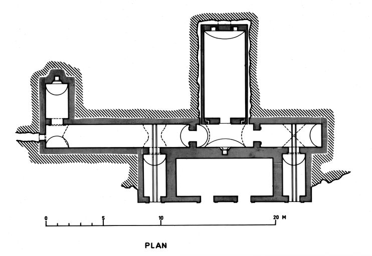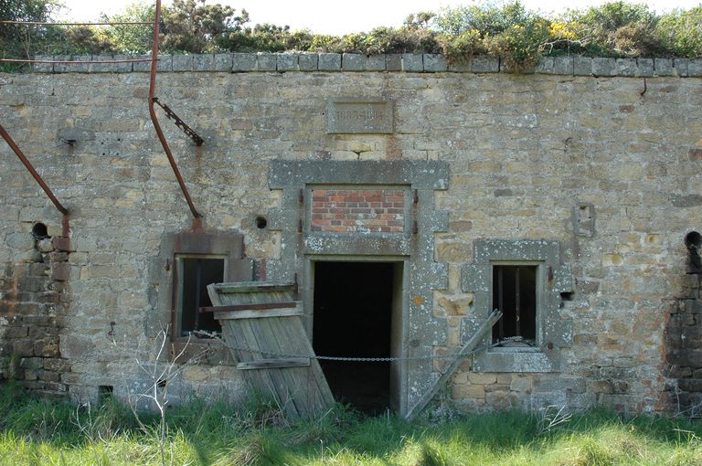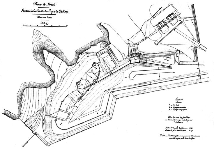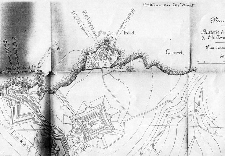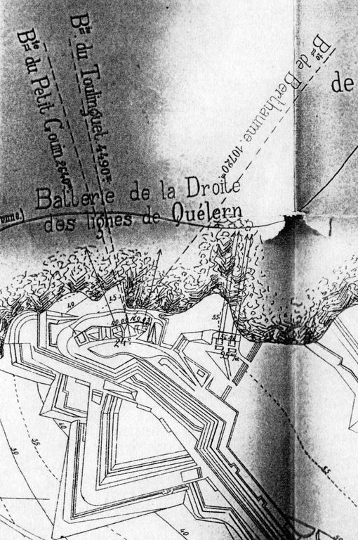 Construite en 1883-1884 (date portée), la batterie d’artillerie de la Droite des lignes de Quélern est armée de deux canons G de 24 cm modèle 1876 sur affût G PC [plate-forme de côte] et de deux canons de 16 cm modèle 1858-60.