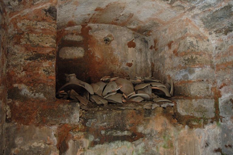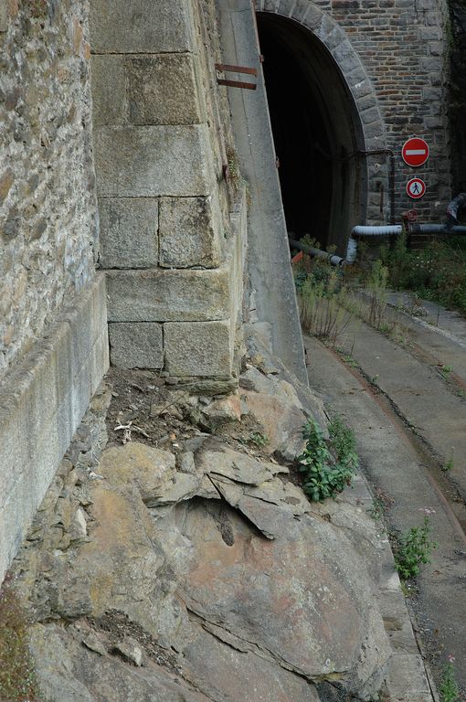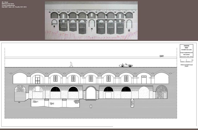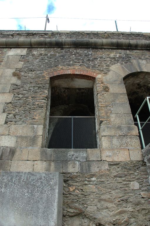 - en sous-sol : une galerie voûtée servant de magasins et donnant sur la terrasse orientale basse ; trois cuves pour les matériaux de calfatage comme des brais bitumineux ou goudrons (au nord, trois autres cuves sont restées à l’état de projet), elles sont accessibles par des trappes aménagées dans le sol du rez-de-chaussée ; au sud, seulement accessibles par un escalier, des latrines collectives (à 18 places selon les emplacements au sol) voûtées en cul-de-four accessibles par une porte puis trois (les latrines nord sont restées à l’état de projet) ; plusieurs canalisations souterraines pour les eaux du vallon de Pontaniou dont l’une alimente les latrines. A l’extérieur, à ce niveau côté Penfeld, chaussée - terrasse secondaire accessible par trois escaliers.