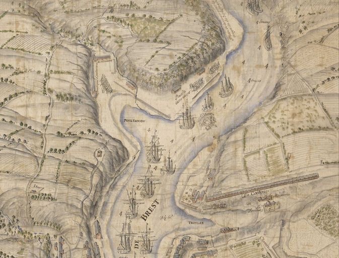 Collection Nivart. MS144_199. Plan cavalier de la ville de Brest, de son port et du bourg de Recouvrance avec l'indication de l'état des travaux de l´arsenal et du port. 1678 (?). Plan, support papier, 1,079 x 0,782 mètre, 4e quart 17e siècle, 1678 (?).