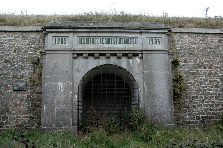Au-dessus de la porte monumentale en arc plein cintre, on peut lire : "1902 REDUIT DE LA CROIX SAINT-MICHEL 1906".