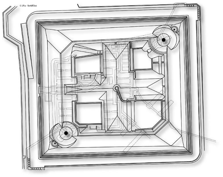 - Coupe axonométrique d'une tourelle à éclipse pour deux canons de 75 mm Raccourcis modèle 1905 (Bruno Rolle publié dans l'Index de la fortification française 1874-1914 - Fortiff.be)