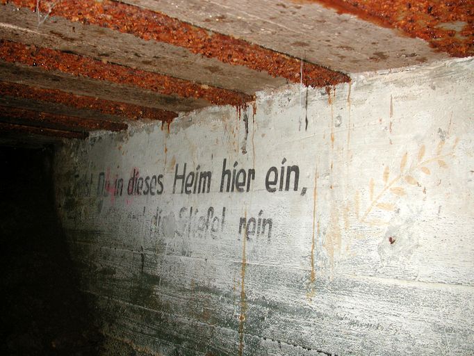 Dans l'entrée du bunker, sur le mur ouest : maxime en allemand peinte en trait de couleur noire (en partie effacée) accompagnée de feuillage vert clair/ocre, " Trittst Du in dieses Heim hier ein, / mache erst die Stiefel rein" que l'on peut traduire par "Si tu veux pénétrer dans ce foyer, nettoie d'abord tes bottes".