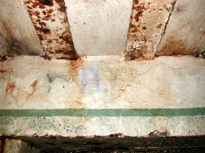 Au-dessus de la porte de la pièce de vie, en trait de couleur bleu, marquage "B." pour l’abréviation de "Brest". La numérotation de l'ensemble fortifié est illisible (et non connue avec certitude).