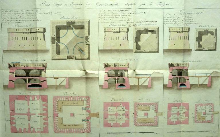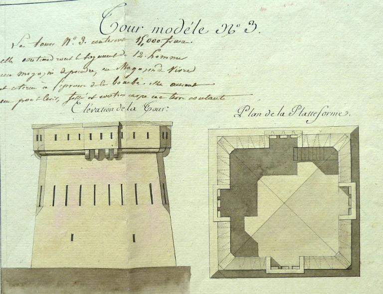 Paragraphe 1 : Mémoires généraux, Carton 9 : 1812-1814) Pièce n° 20 : 1811 . Carte générale des côtes comprises entre la rade de Cancale et la rivière de Quimperlé par la commission des côtes. Sont mentionnées les batteries existantes et proposées pour la défense des côtes. Pièce n° 21 : 1811 . Tableau des tours - modèles proposées dans la direction d´artillerie de Brest. " Etat indicatif des batteries de côte auxquelles il conviendrait conformément à l'ordre de sa majesté, en date du 2 mai, d'établir, pour leur défense des tours de différents modèles, à raison de l'importance de la batterie ". Pièce n° 28 : 1811. Mémoire sur la position des tours - modèles 1811 (L´île des Landes, batterie de Corbière, batterie de Pontrieux, batterie de Postermen, Conquet jusqu´à Port-Blanc).