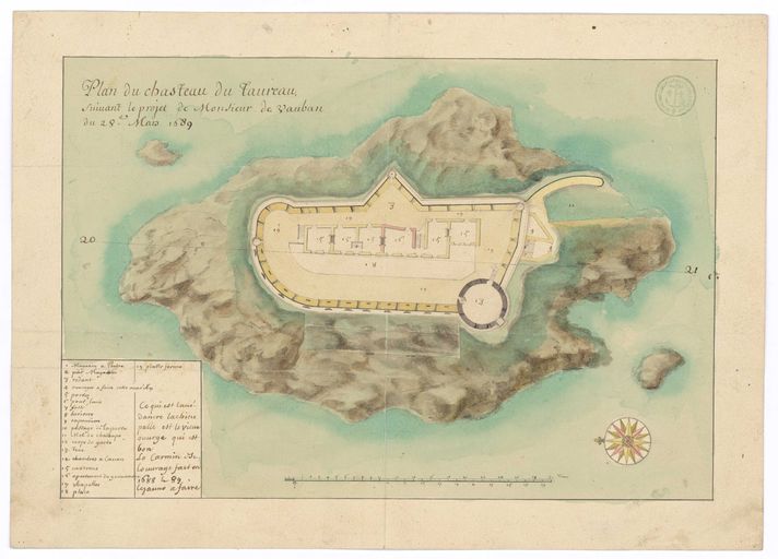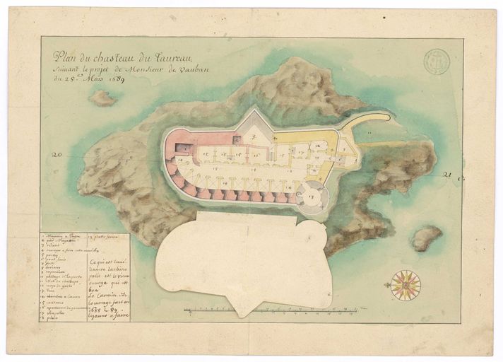 Ainsi, à la fin du 17e siècle, trois grands pôles concentrent la majeure partie des ouvrages de fortifications : Brest, la ville-arsenal, Saint-Malo, le port transatlantique devenu cité-corsaire et le havre de L'Orient/Port-Louis, s'étendant au sud jusqu'à la presqu'île de Quiberon et comprenant les îles de Hoedic, Houat et surtout Belle-Île. Sur un littoral breton de plus de 2 600 kilomètres, le nombre de points-forts - comprendre ici les ensembles fortifiés, du simple corps de garde à l'enceinte urbaine en passant par les forts et batteries de côte - est relativement stable au cours d´un vaste 18e siècle, de l´ordre de 350 dont près de 30 % sont situés dans les îles formant une la "contre-escarpe insulaire" comme le suggère J. Le Corre : ainsi Cézembre, l´archipel de Bréhat, celui des Sept-îles, Batz, Cézon, Ouessant, Molène, Groix, Belle-île, Houat et Hoedic, etc... (En 1779, un Etat des défenses côtières du royaume recense encore en Bretagne 342 ensembles fortifiés, rassemblant 1 390 canons, soit une moyenne de 4 pièces d'artillerie par site ; Service Historique de la Défense, Bibliothèque du Génie, MR 1091, côtes de l´Océan.).