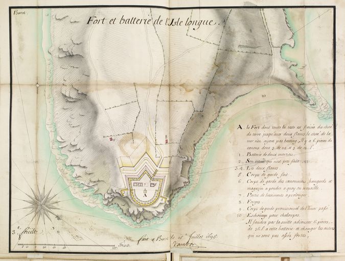 D´après le plan de Garengeau daté du 18 juillet 1694, un tiers du fort seulement (la partie sud) est construit et s´élève à 6 pied au dessus du rez-de-chaussée. On distingue déjà cependant, l´entrée, le corridor, le magasin à poudre, un "magasin à serrer les bombes", "deux souterrains", une plate-forme pour deux mortiers. Le corps de garde est armé de deux canons de 36 livres de balle tandis que sur le rocher situé au coeur de l´ouvrage actuel ont été aménagés des baraquements pour loger les officiers, les canonniers et les ouvriers, ainsi qu´une plate-forme temporaire pour deux pièces de 24 livres de balle.