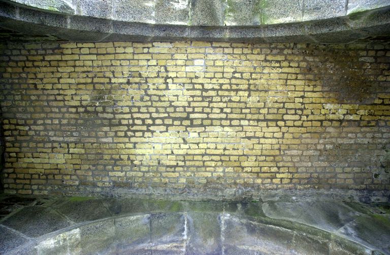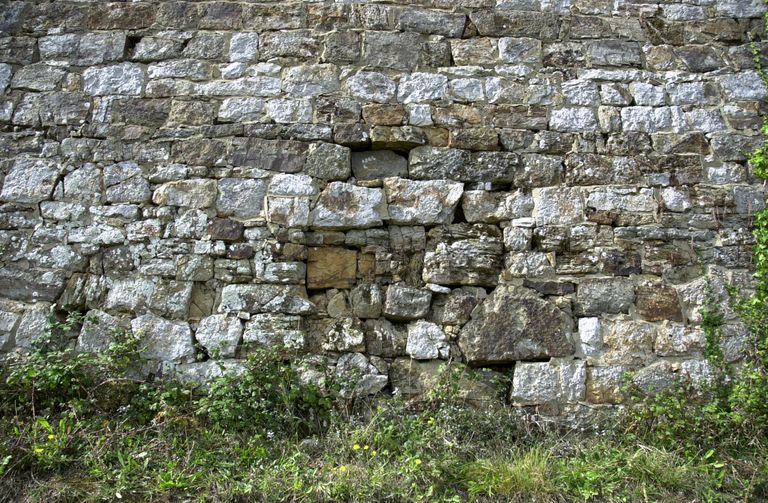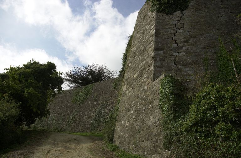 Face Ouest. Seule face restée dégagée de l'ouvrage d'origine, elle se présente à I'extérieur sous forme d'un mur d'escarpe en moellons de granite, avec fruit, couronné d'une tablette. Au milieu, légèrement désaxée vers le nord se trouve, au niveau du sol, la porte d'entrée de l'ouvrage, massif de maçonnerie en saillie sur l'escarpe et dont le dessus s'amortit en cavet. Dans ce massif s'ouvre le passage, en voûte surbaissée du couloir d'entrée. Au-dessus, dans l'escarpe, un petit tableau rectecgulaire porte la date de 1776.