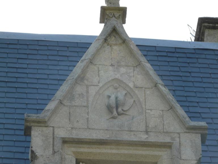 Sur la route de Guengat, l’entrée du château est marquée par un portail en fer forgé circulaire encadré par deux piliers surmontés d’un couronnement crénelé. Juste après l’entrée monumentale, se dresse à gauche l’ancienne maison de gardien aménagée en gîte. La maison de gardien présente un plan carré avec une aile en retour d’équerre, elle est enduite en blanc et la pierre de taille granit est employée pour les éléments de décor ou de couvrement.