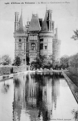 'Situé sur la commune de Saint-Goazec, au centre Finistère, dans un site surplombant la vallée de l'Aulne, le domaine de Trévarez fut construit de 1893 à 1907 non loin d'un ancien manoir. La personnalité de son commanditaire, ancien diplomate, président du Conseil général, député, associée au savoir faire d'un atelier d'architectes parisien, mondain et international, dirigé par W.A. Destailleurs, contribua à l'établissement de constructions conçues et mises en oeuvre avec un soin extrême. Le château est édifié en granit de Kersanton et en brique, selon un style en accord avec les modes de vie et de représentation de la très haute bourgeoisie financière de l'époque. Il rappelle d'ailleurs les hôtels particuliers new-yorkais construits par les Vanderbilt sur la 5ème avenue, aujourd'hui disparus, et qui pastichaient les détails d'ornementation de l'architecture Renaissance. La plus grande partie du chantier, exceptés le gros oeuvre de maçonnerie et la sculpture ornementale, fut réalisée par des entreprises parisiennes, alliant savoir faire traditionnel et emploi des techniques avancées en matière de charpenterie métallique ou d'installation électrique. Ce château de la "Loire", pourvu d'un très moderne ascenseur comme d'un somptueux escalier d'honneur au décor Renaissant, est véritablement une création ex nihilo, d'une ampleur qui ne pourra être imitée après avec la crise engendrée par la 1ère guerre mondiale. Il figura d'ailleurs parmi la sélection nationale pour l'architecture à l'Exposition universelle de Chicago en 1904. Le château fut malheureusement sinistré en partie par un bombardement en 1944 et resta en l'état jusqu'à nos jours ; quant à ses abords, ils furent remis en valeur peu à peu par le nouveau propriétaire du domaine, le Conseil général du Finistère. Ouvert à la visite depuis 1971, son parc de 75 hectares est le lieu d'un important concours hippique et de floralies réputées'.