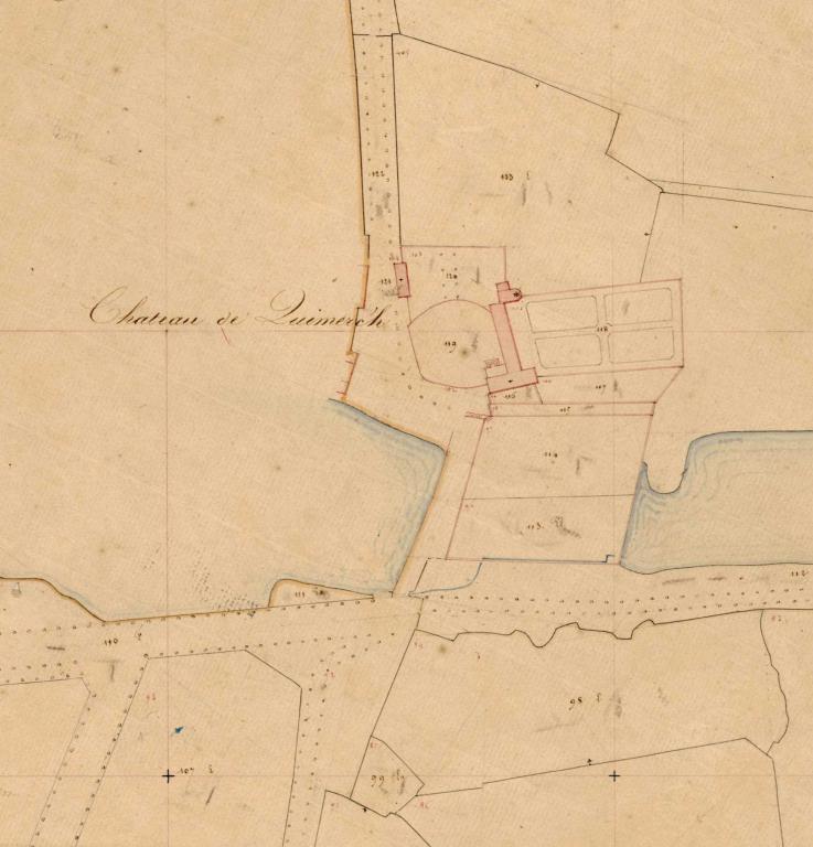 Le cadastre parcellaire révèle les environs proches du château de Quimerc’h (II) en 1844 composés de son logis, d’une chapelle, d’une cour, de murs de clôture, d’un jardin, d’un parc et de dépendances, d’un étang et d’un moulin... La motte de Castel-Quimerc'h - site primitif du château de Quimerc'h - est située à 700 m à l’est-nord-est du château (II).