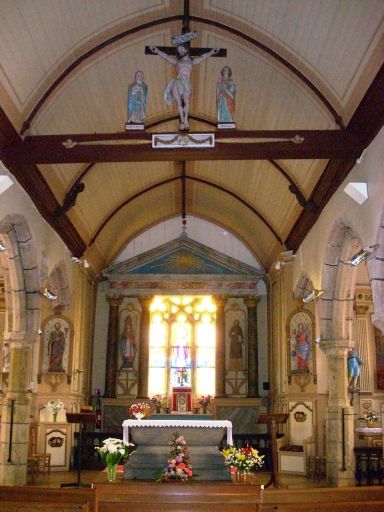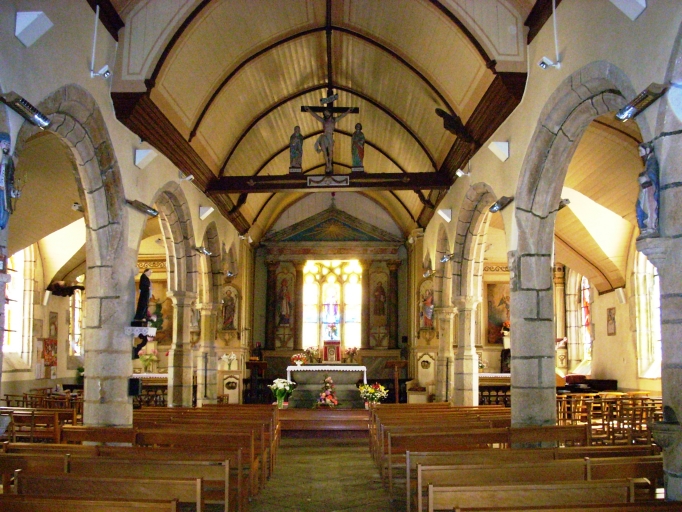 Plan rectangulaire à trois vaisseaux. Chevet plat flanqué de deux sacristies au nord et au sud. Clocher hors-oeuvre au sud à deux galeries et deux étages de cloches ajourés amortis d´une flèche octogonale ajourée encadrée à sa base par quatre pinacles. Gros oeuvre en moellon et en pierre de taille de granite. Nef à six travées couverte d´un lambris blanc et jaune à nervures marron. Poutre de gloire. Arcades en plein-cintre surbaissé pénétrant directement dans les colonnes à l´exception des deux dernières travées reposant sur les chapiteaux des piliers octogonaux. Sol couvert de ciment et de dalles de granite. Chapelle des fonts baptismaux au sud de la première travée.