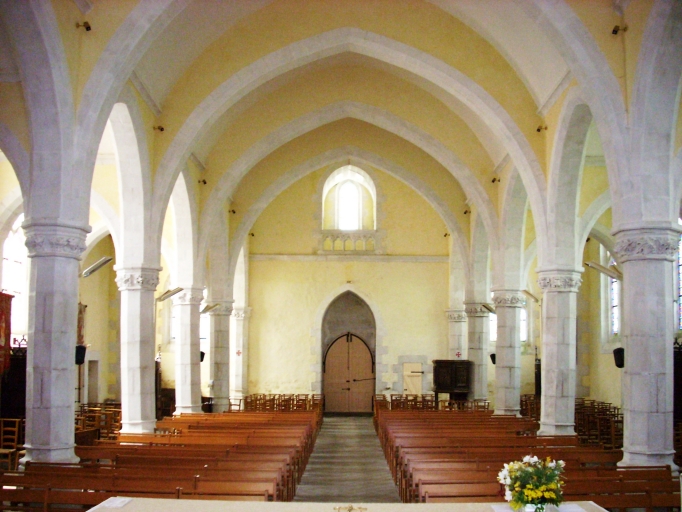 Plan en croix latine, à trois vaisseaux et à six travées. Gros oeuvre en moellon équarri de gneiss et de granite partiellement enduit de ciment peint en blanc et en jaune, à l´exception des encadrements de baies et des chaînages d´angle, en pierre de taille de granite. Sacristie dans-oeuvre dans le prolongement de la chapelle latérale sud. Clocher hors-oeuvre, flanqué d´une tour d´escalier, avec chambre de cloches ajourée amortie d´une flèche octogonale à gables ajourés et encadrée à sa base de quatre pinacles. Porche sud hors-oeuvre avec voussures moulurées, et gable coupant les piédroits au-dessus de l´accolade. Choeur peu profond à chevet plat. Chapelles latérales au niveau de la sixième travée formant faux-transept. Voûte en arc brisé. Arcades en arc brisé retombant sur des chapiteaux octogonaux à motifs végétaux soutenus par des piliers octogonaux. Sol couvert de ciment.