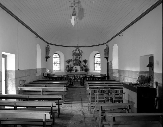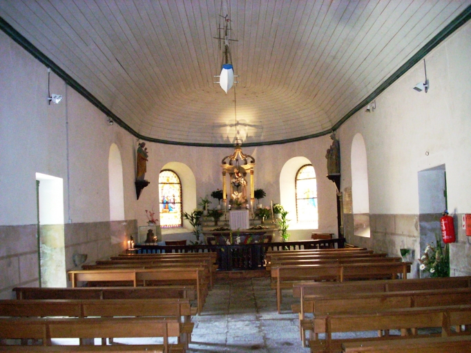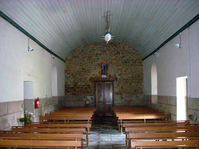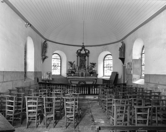 Plan allongé à vaisseau unique. Chevet à pans coupés flanqué d´une petite sacristie au sud. Pignon ouest coiffé d'un clocheton. Gros oeuvre en moellon de granite enduit, à l´exception des encadrements des baies et des chaînages d´angle en pierre de taille de granite. Lambris de couvrement blanc. Sol couvert de dalles de granite.