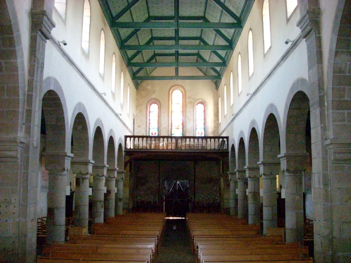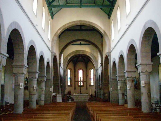 Plan en croix latine. Chevet à pans coupés. Sacristie hors-oeuvre au nord de la chapelle latérale nord. Clocher hors-oeuvre flanqué d´une tourelle d´escalier à l´ouest, chambre des cloches surmontée d´une flèche carrée amortie d´un lanternon et encadrée à sa base par quatre lanternon et quatre frontons. Gros oeuvre en moellon de granite enduit de ciment, à l´exception des encadrements des baies et des chaînages d´angle, en pierre de taille de granite. Nef éclairée par des fenêtres hautes, à trois vaisseaux à six travées. Arcades en plein-cintres reposant sur les chapiteaux des colonnes. Choeur de deux travées. Chapelles latérales formant faux transept. Lambris de couvrement, entraits, poinçons et sablières peints en bleu. Sol couvert de dalles de granite.