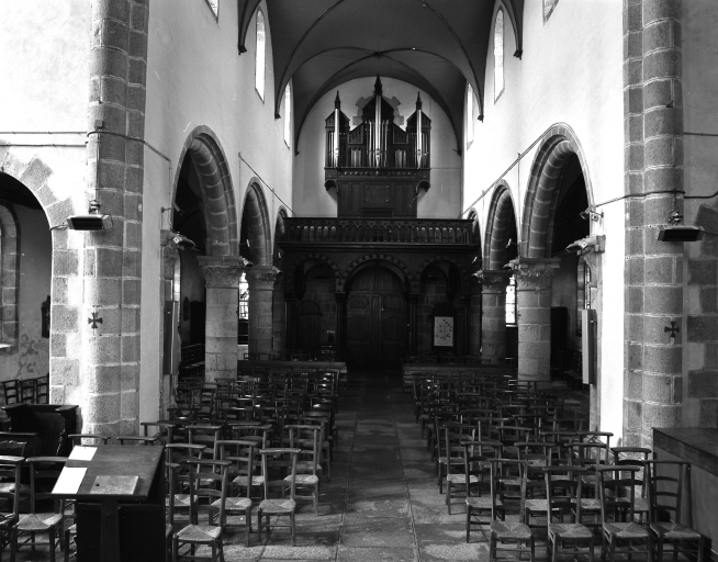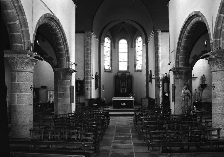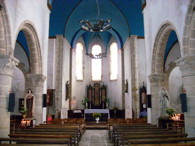 Plan en croix latine à trois vaisseaux. Chevet semi-circulaire. Clocher à une chambre de cloches ajourée amortie d´une flèche octogonale encadrée à sa base par quatre lanternons et quatre frontons ajourés. Tour d'escalier à escalier en vis sans jour. Gros oeuvre en moellon de granite enduit à l´exception des encadrements des baies et des chaînages d´angle en pierre de taille de granite. Nef à trois travées couverte d´un lambris peint en bleu et nervures en marron et éclairée par des fenêtres hautes. Arcades plein-cintre reposant sur les chapiteaux des colonnes. Tribune à l´ouest.
